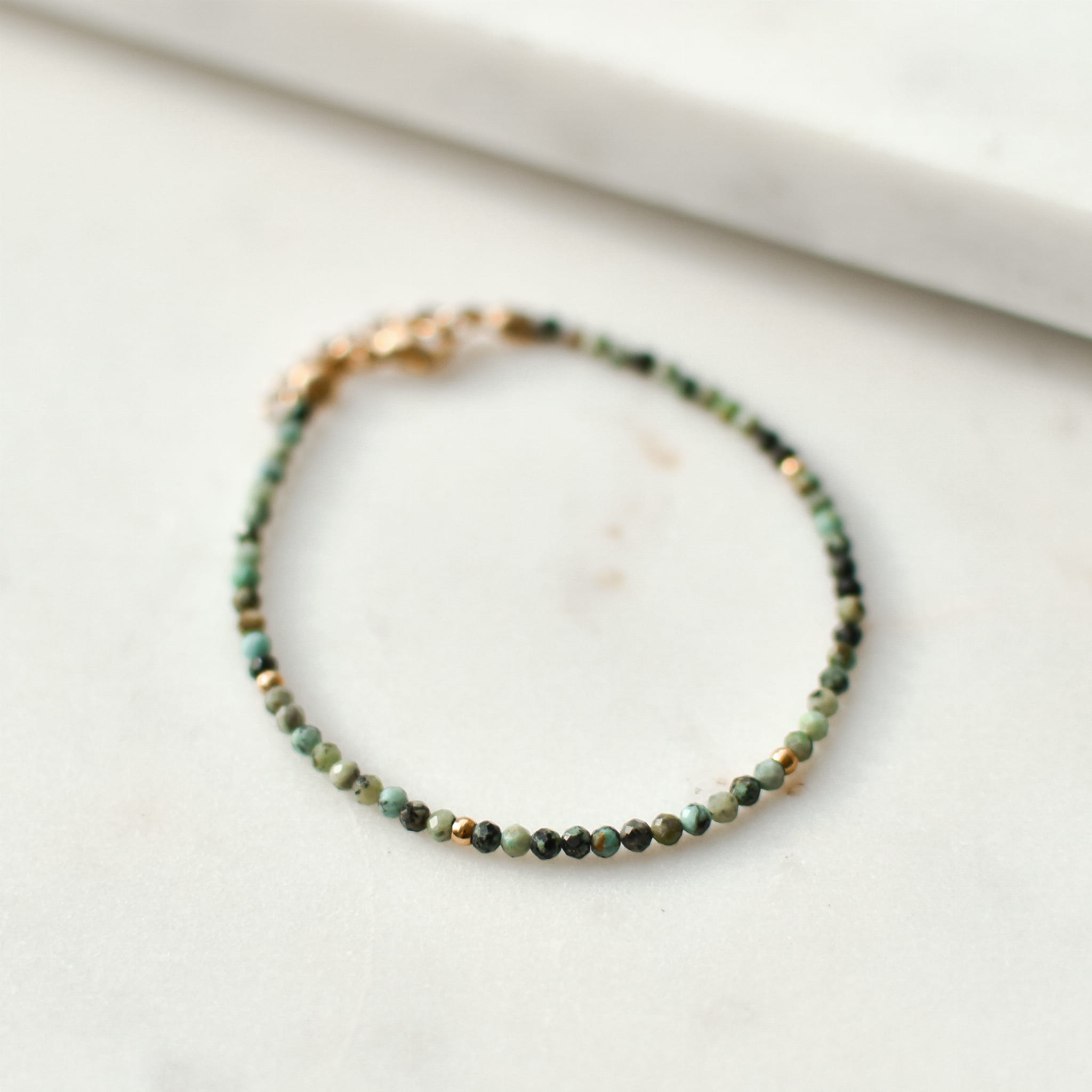 BRANSOLETKA ALGAE wykonana z Turkusu Afrykańskiego oraz złotych kulek ze stali chirurgicznej.