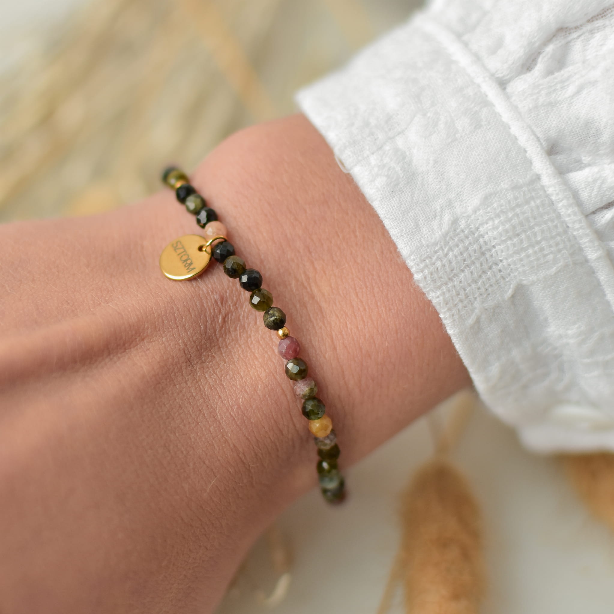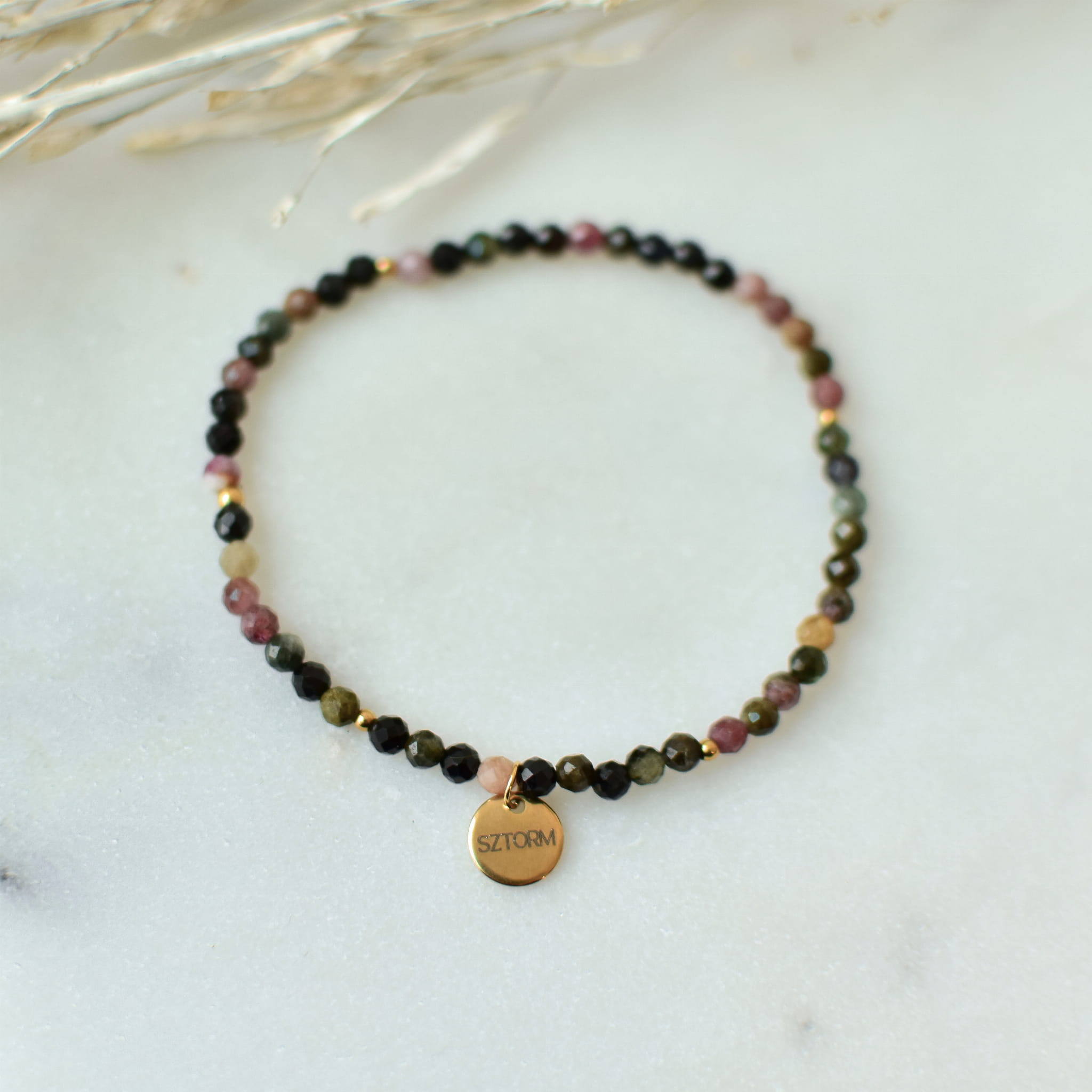 BRANSOLETKA ISLE III na gumce wykonana z Turmalinu oraz złotych kulek ze stali chirurgicznej.