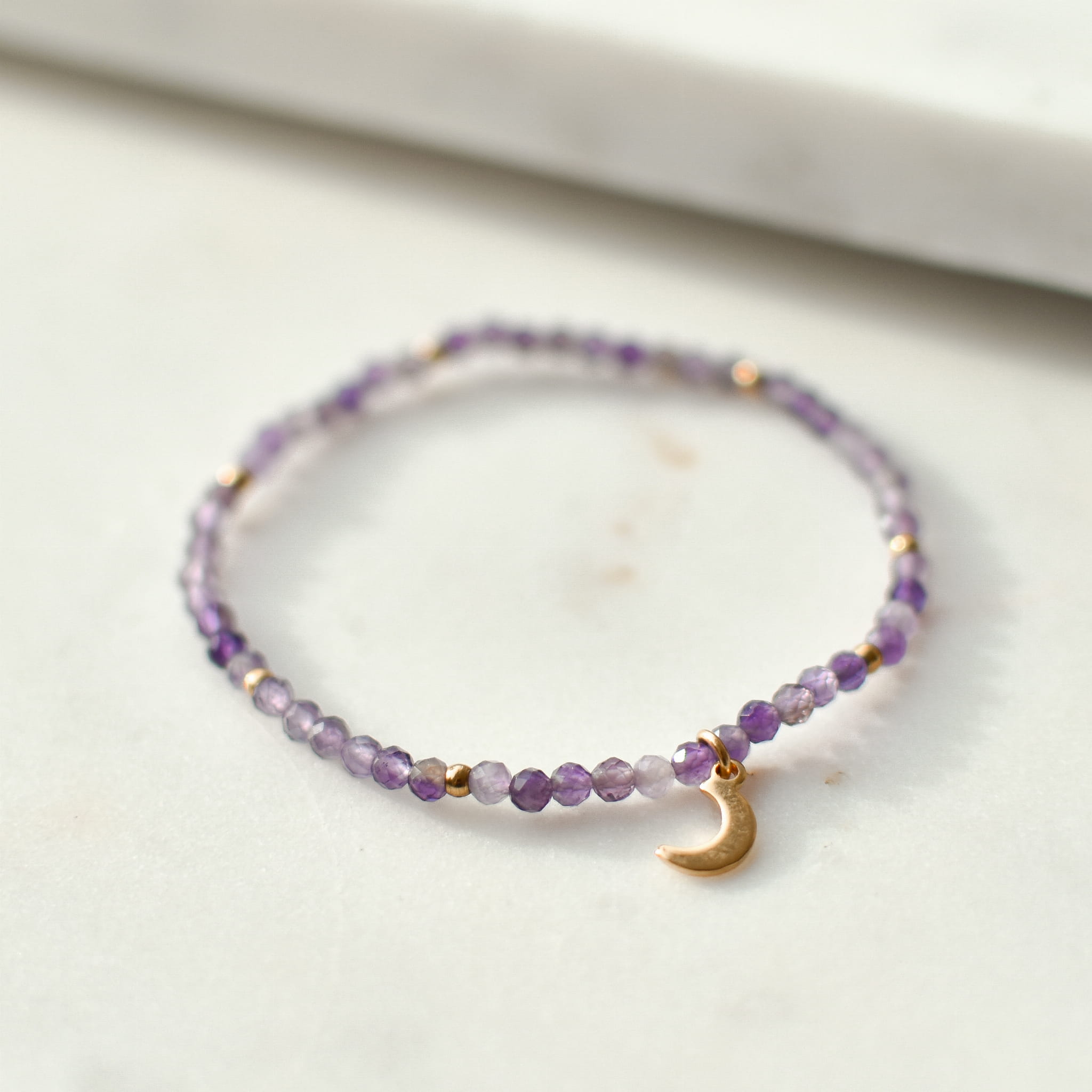 BRANSOLETKA SHALLOW wykonana z Ametystu, złotych kulek oraz zawieszki w kształcie księżyca ze stali chirurgicznej.
