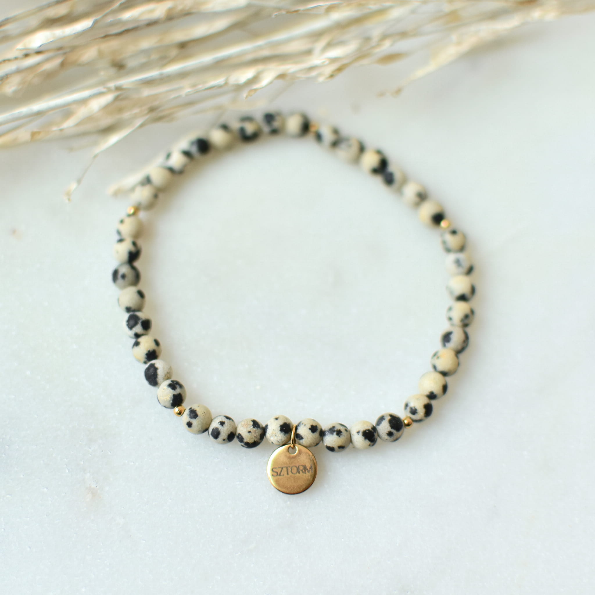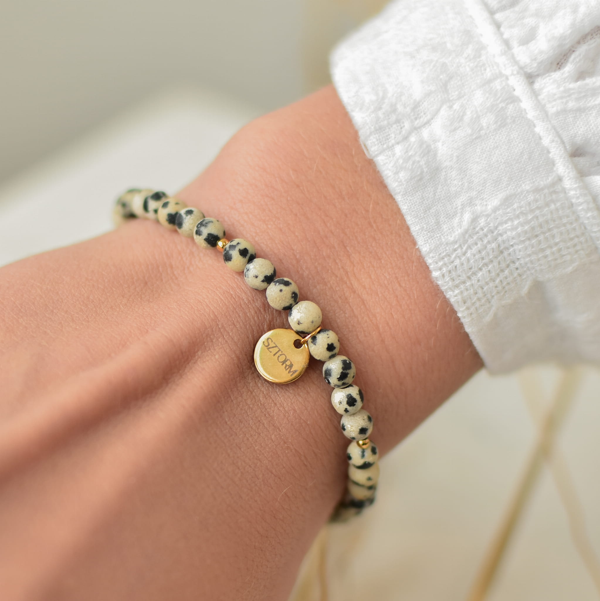 BRANSOLETKA SULU II wykonana z Jaspisu Dalmatyńskiego oraz złotych kulek ze stali chirurgicznej.