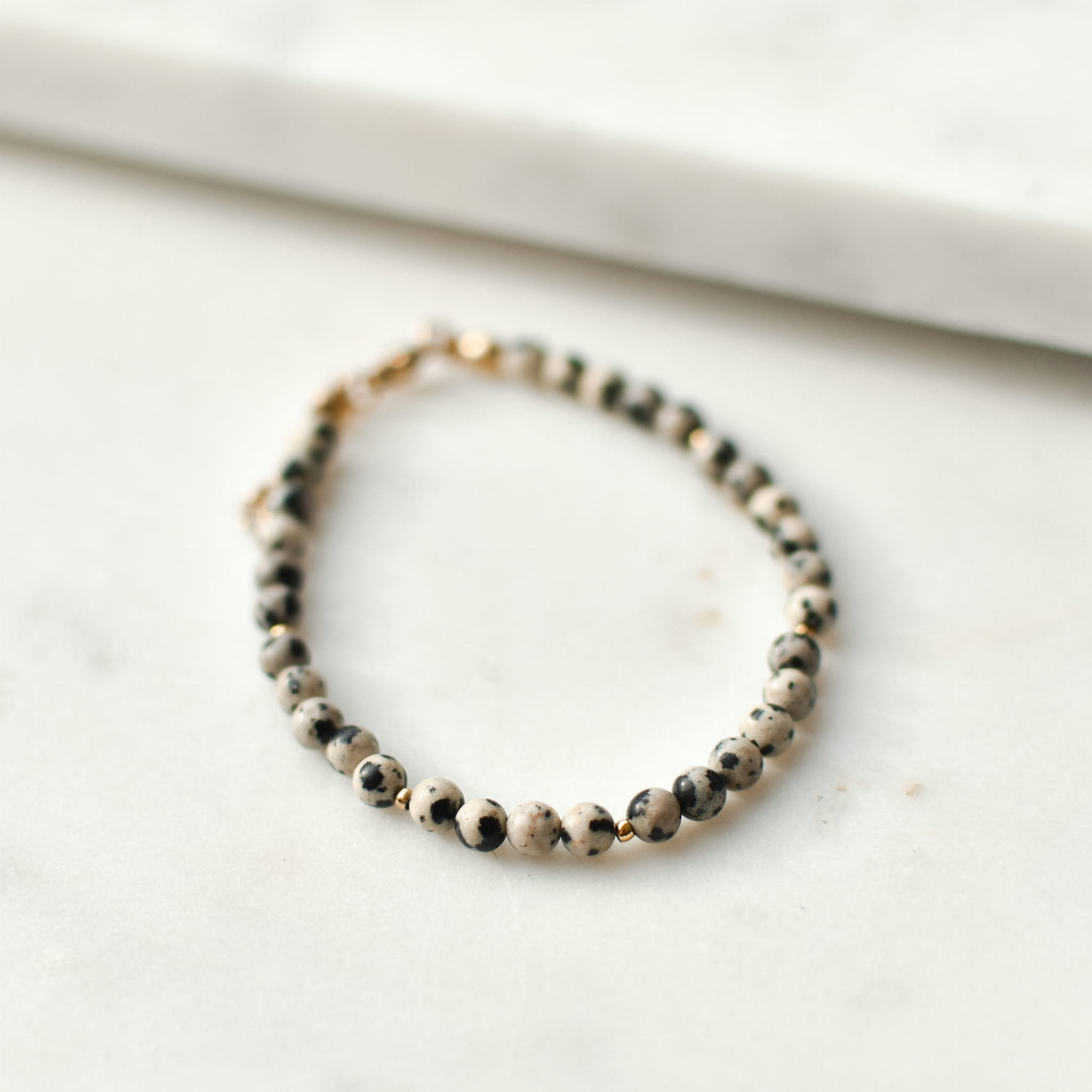 BRANSOLETKA SULU wykonana z Jaspisu Dalmatyńskiego oraz złotych kulek ze stali chirurgicznej.