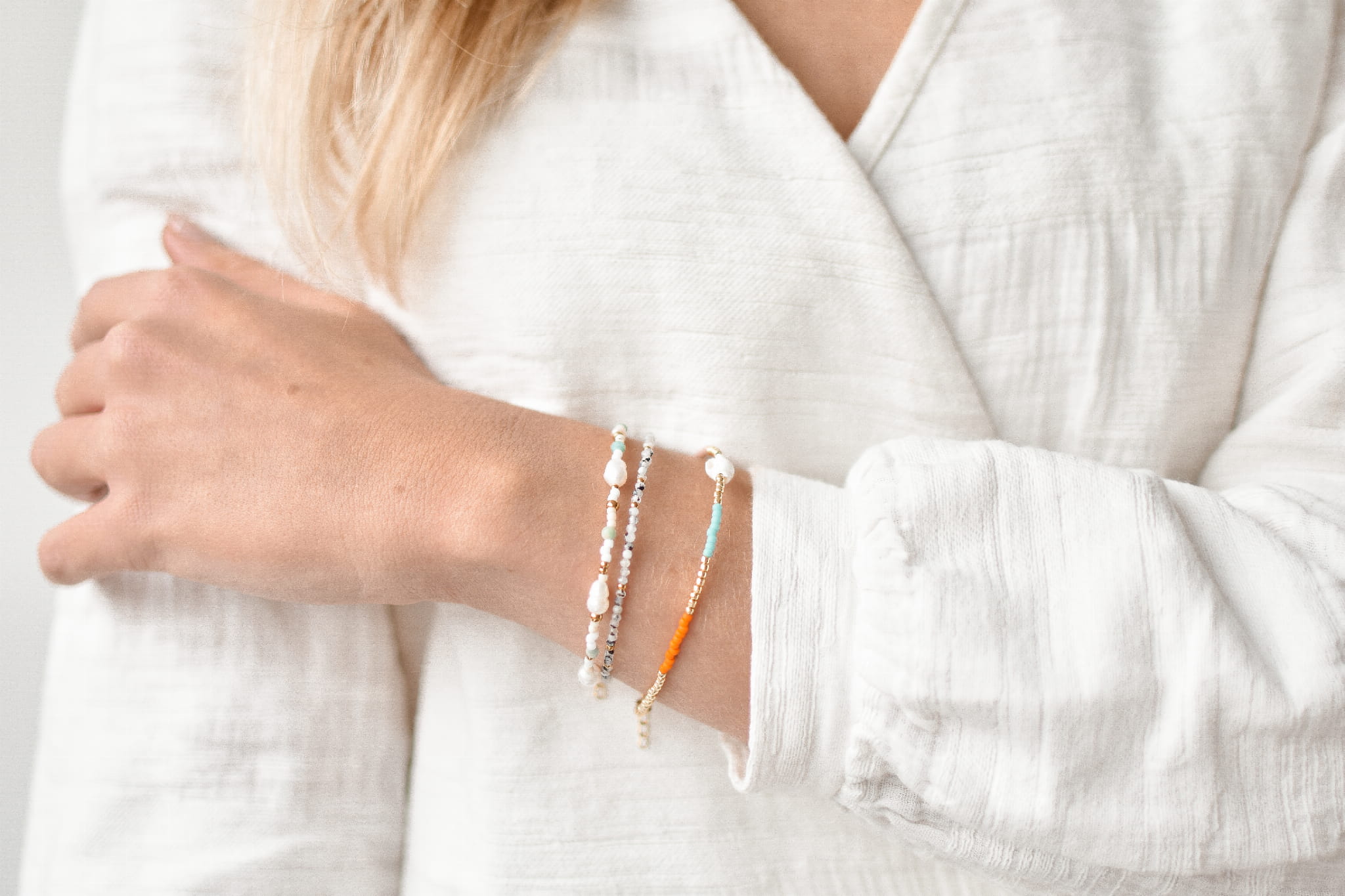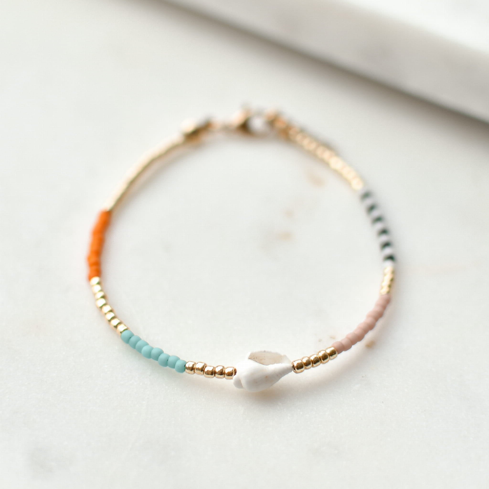 BRANSOLETKA SUMMER wykonana z koralików szklanych w kolorze złotym, różowym, turkusowym, pomarańczowym oraz muszelki na zapięciu ze stali chirurgicznej.