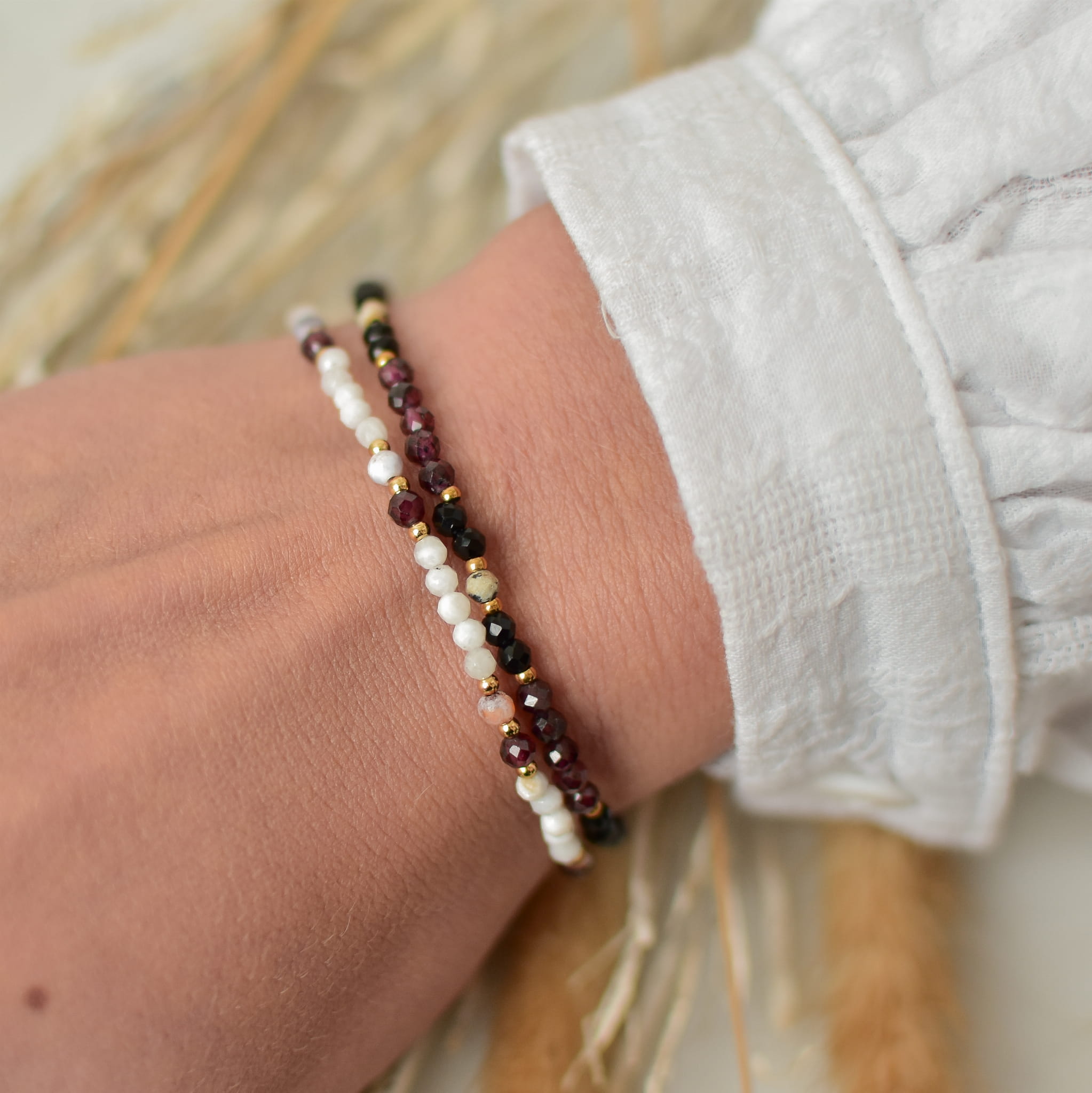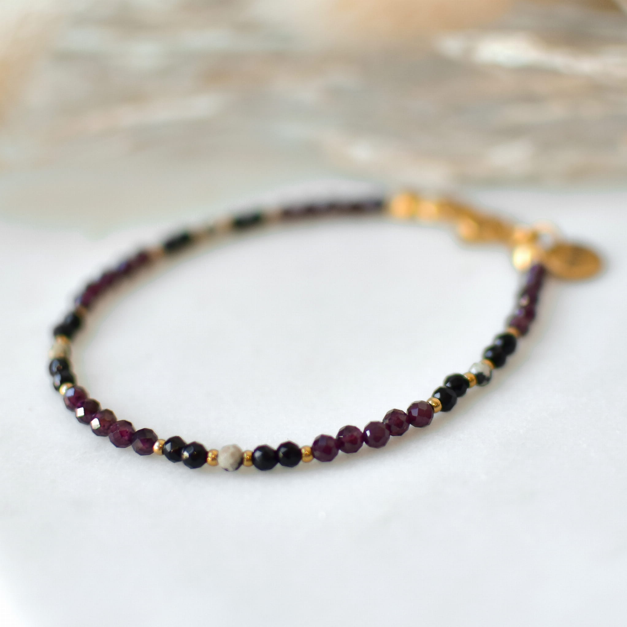 BRANSOLETKA VIOLET wykonana z Granatu, Spinelu, Jaspisu Dalmatyńskiego oraz złotych kulek ze stali chirurgicznej.