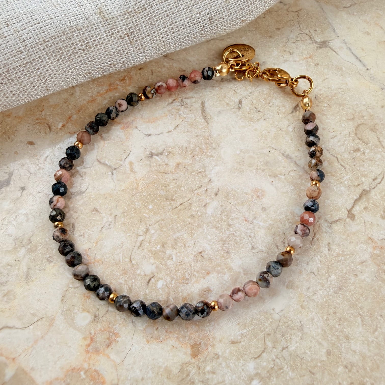 BRANSOLETKA ALICE wykonana z Rodonitu oraz złotych kulek ze stali chirurgicznej.
