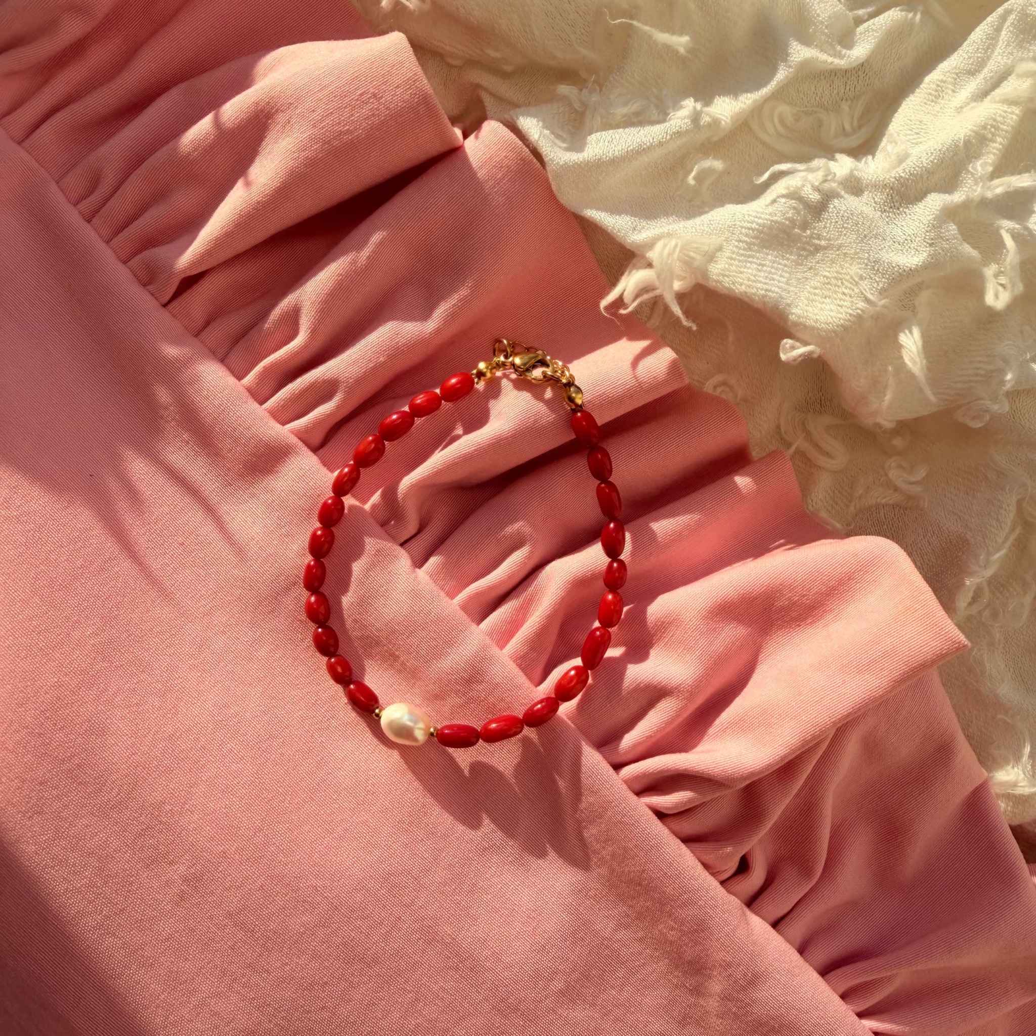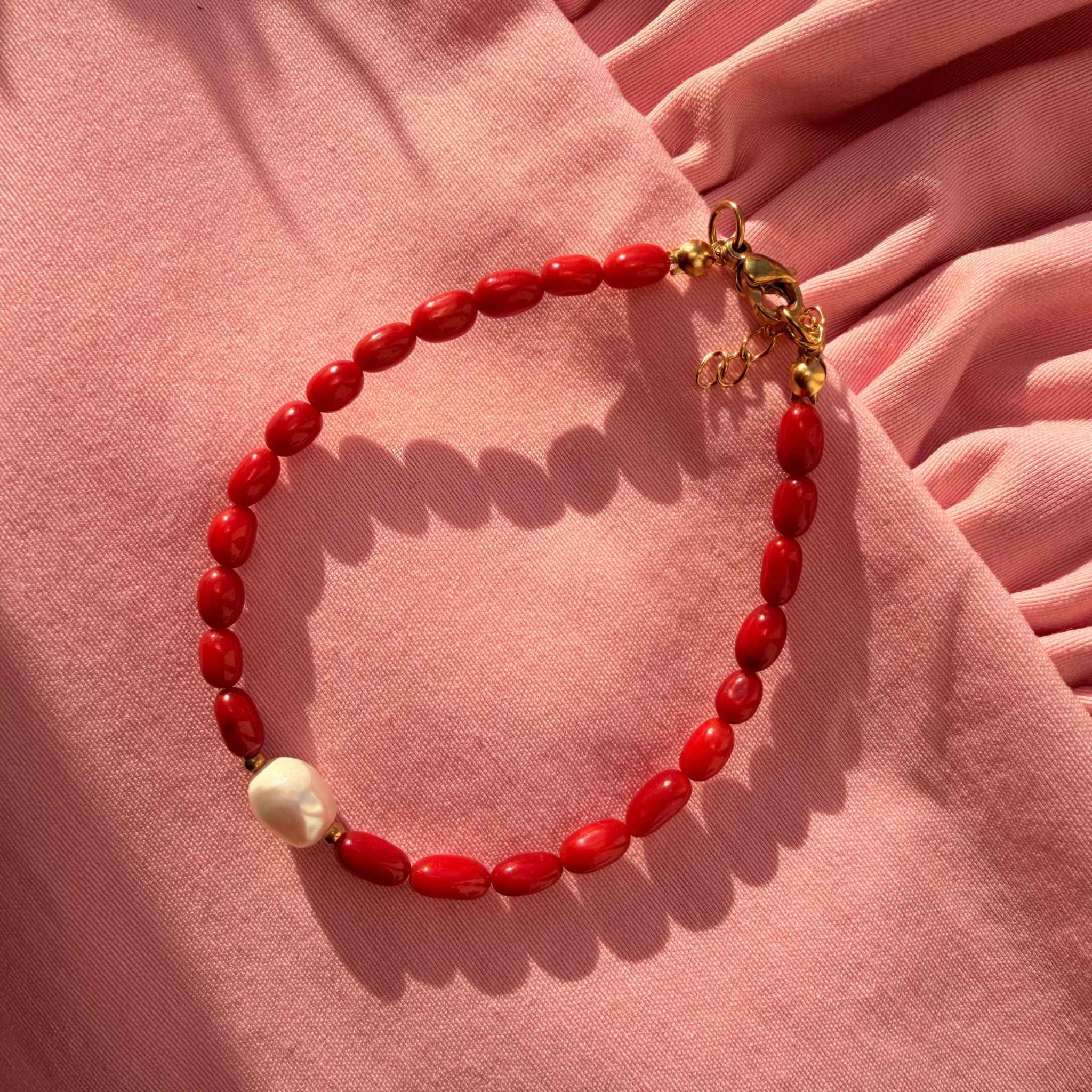 Bransoletka BOJA to wyrazista, a jednocześnie subtelna kompozycja z naturalnego Czerwonego Koralu o średnicy 3 mm, przełamana delikatnym akcentem Perły hodowlanej. Intensywna czerwień koralu przywodzi na myśl morskie boje dryfujące na wodzie, a perłowy detal dodaje całości lekkości i elegancji.