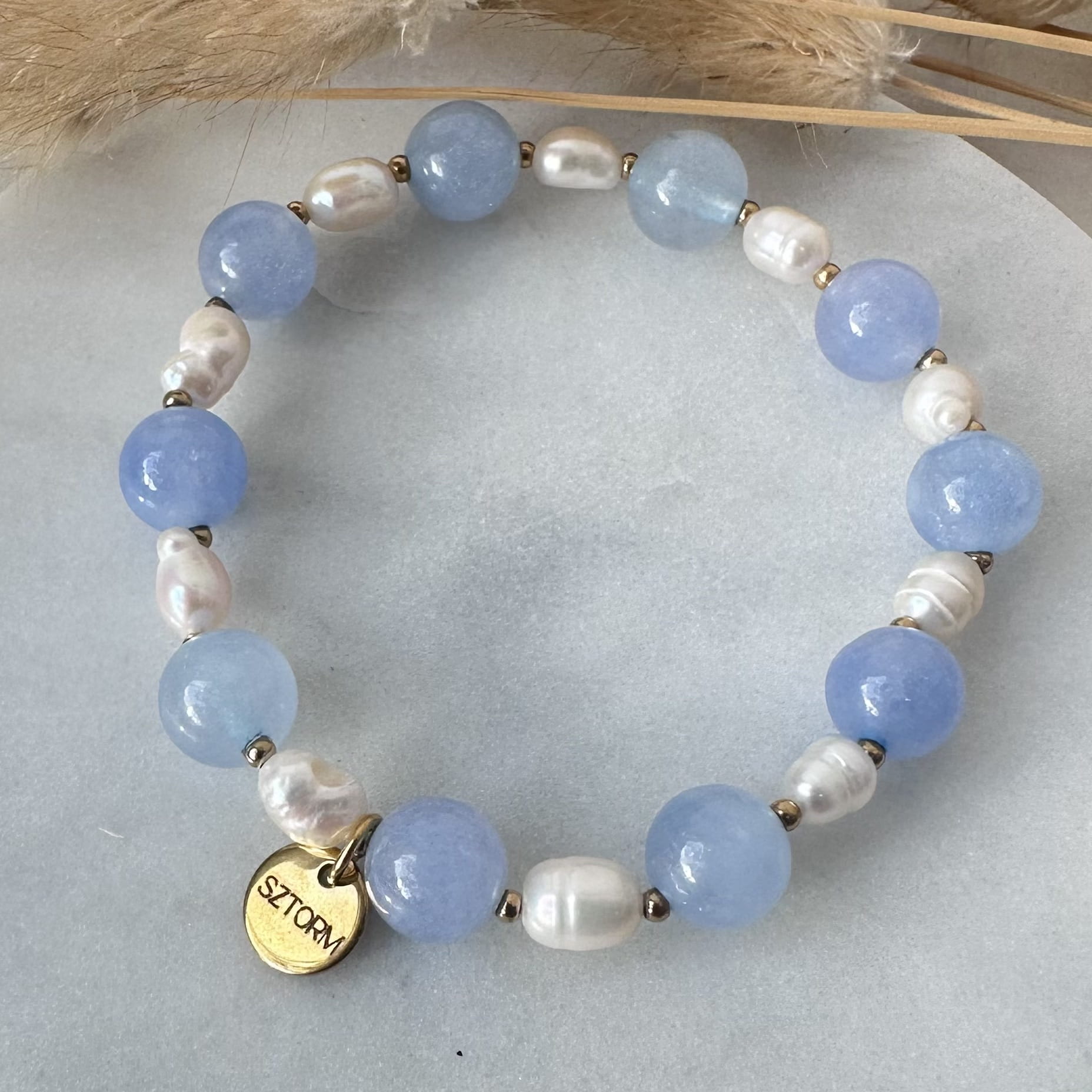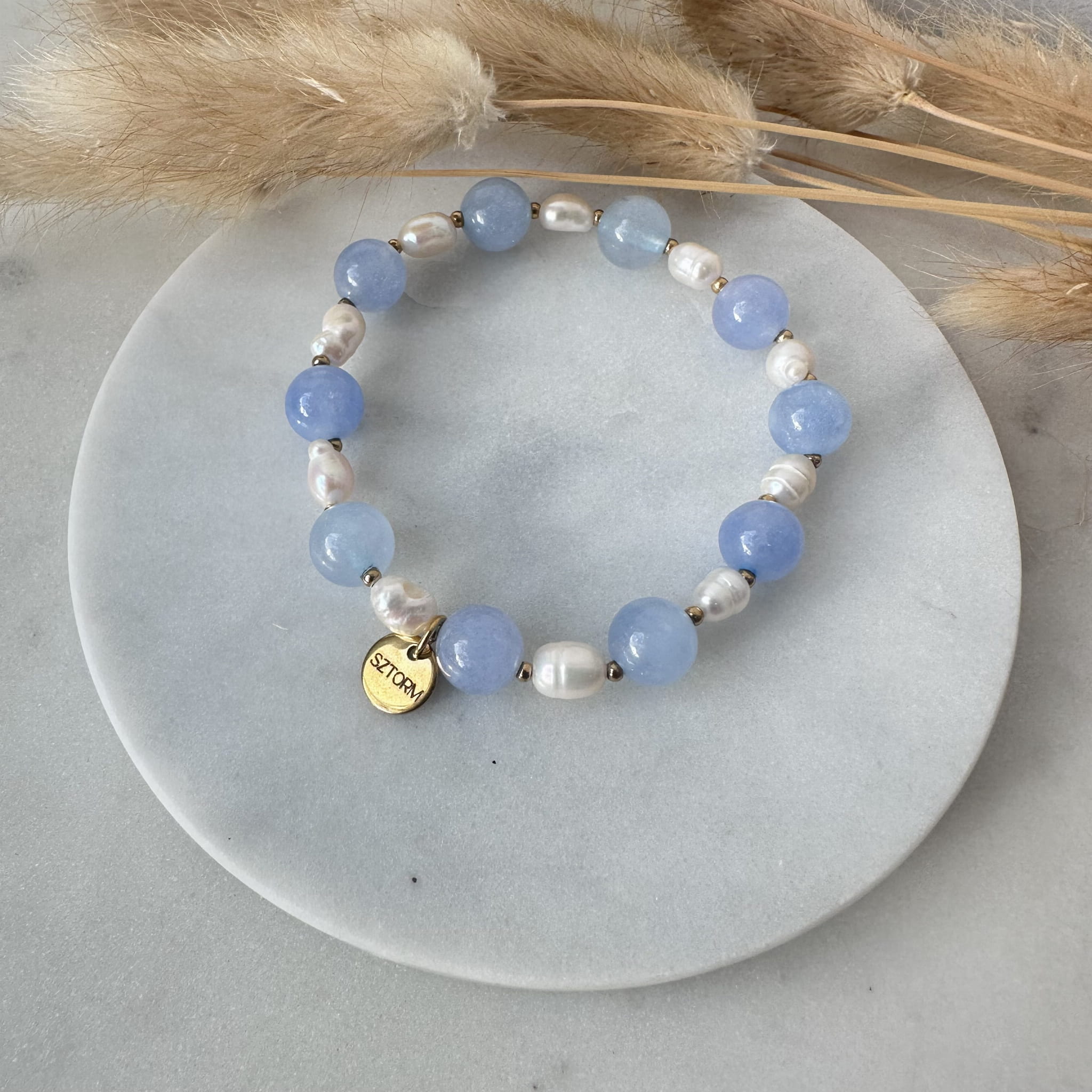 Bransoletka SKY wykonany z Akwamarynu, Perły oraz złotych kulek ze stali chirurgicznej.