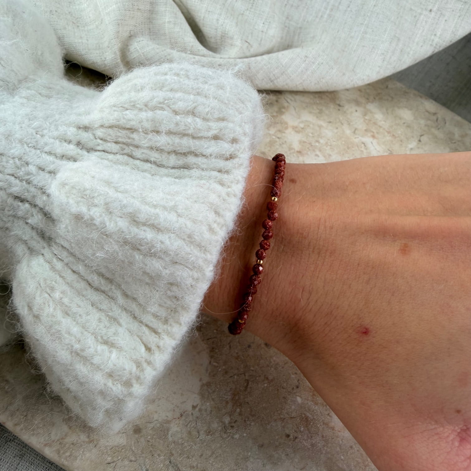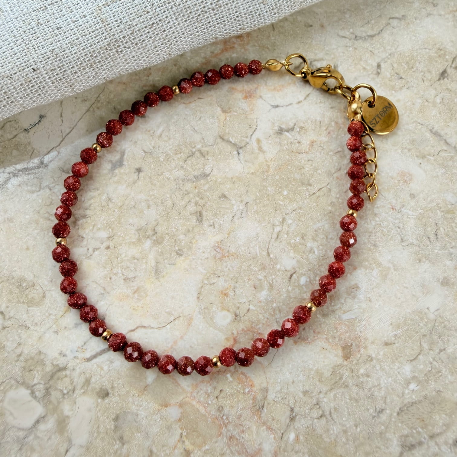 Bransoletka SAND II to elegancka i subtelnie połyskująca kompozycja wykonana z kamienia Piasek Pustyni, znanego ze swojego głębokiego, brązowego koloru z drobnymi, migoczącymi drobinkami. Jego charakterystyczny blask pięknie kontrastuje ze złotymi elementami ze stali chirurgicznej, tworząc biżuterię stylową, nowoczesną i pełną wyrazistości.