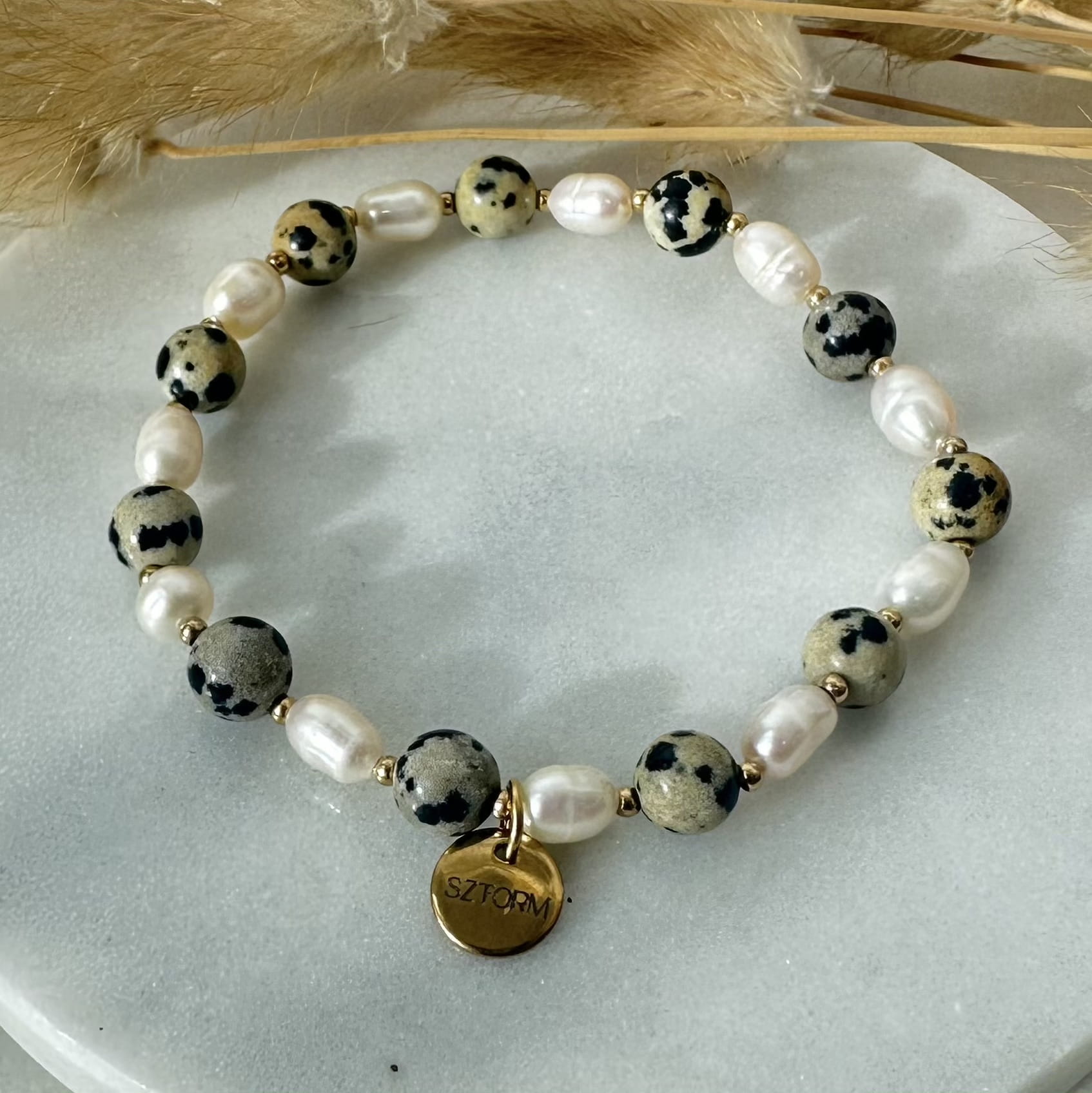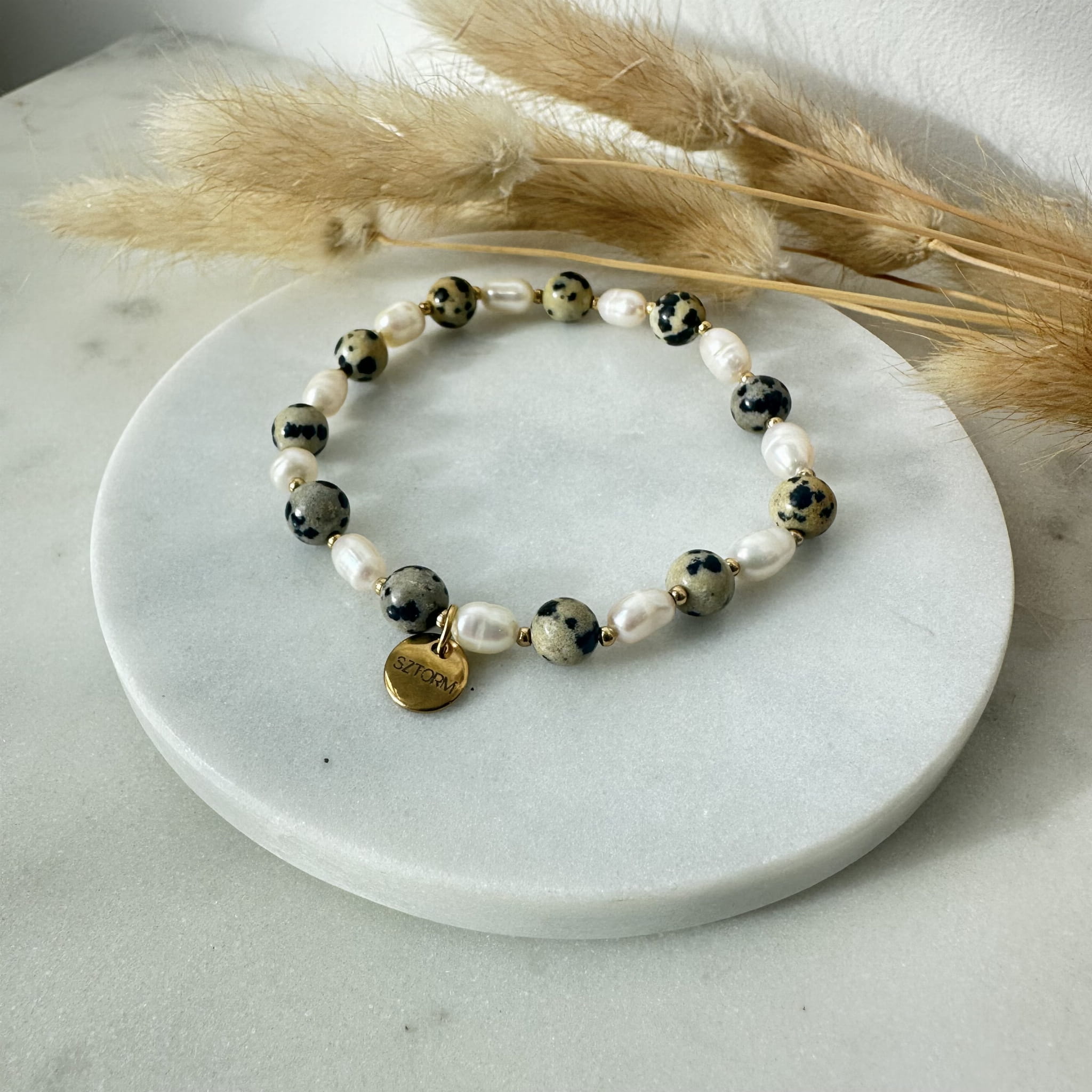 Bransoletka SeaBorn wykonana z Jaspisu Dalmatyńskiego, Pereł oraz złotych kulek ze stali chirurgicznej.