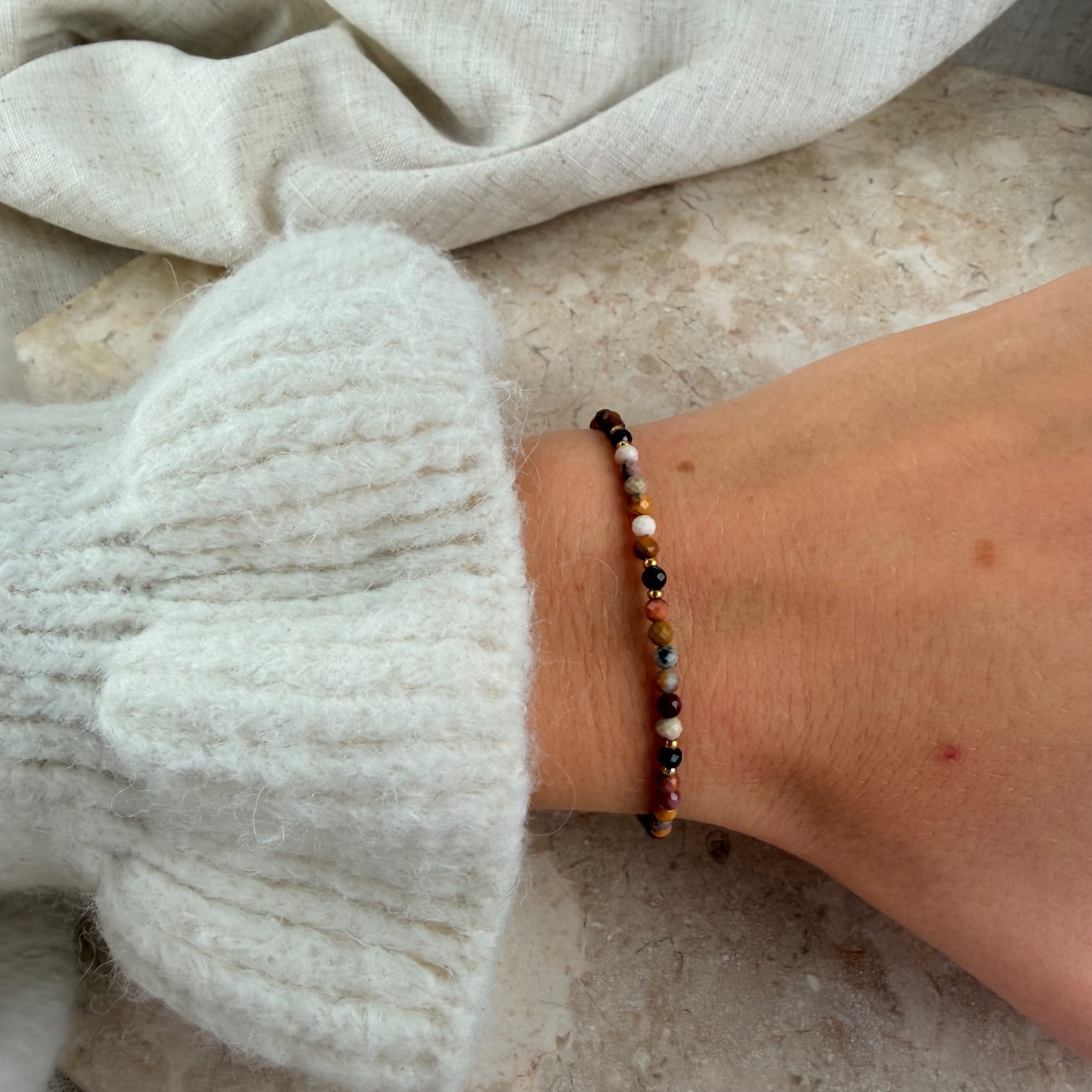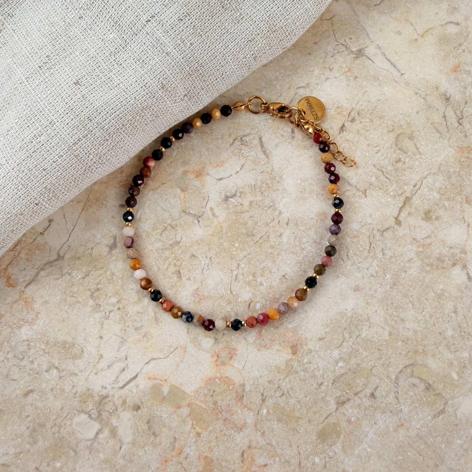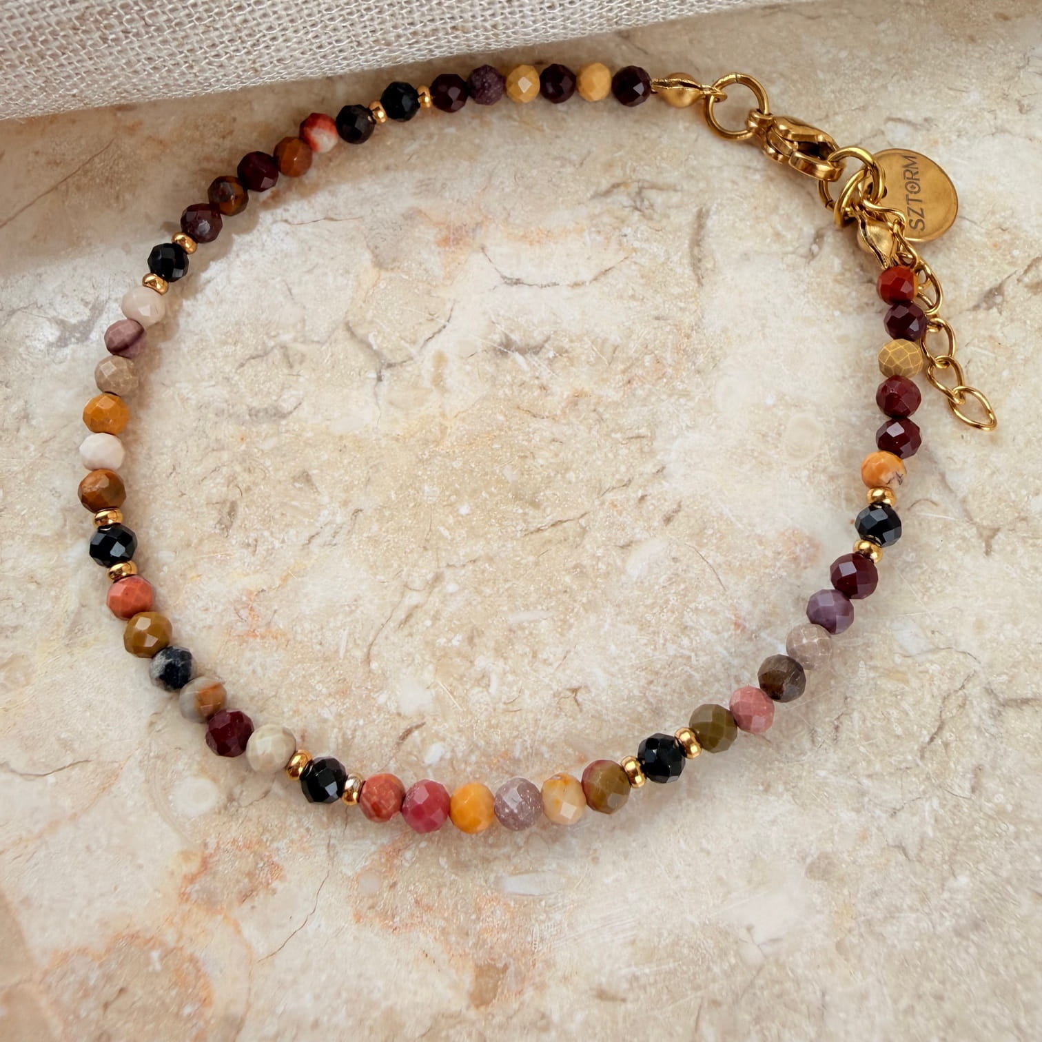Bransoletka SUNSET to wyjątkowa kompozycja stworzona z naturalnego Mokaitu — kamienia o ciepłej palecie barw inspirowanej zachodem słońca. Odcienie żółci, bordo, brązu i różu tworzą harmonijną, ziemistą całość, która pięknie prezentuje się na nadgarstku. Złote elementy ze stali chirurgicznej dodają bransoletce elegancji i podkreślają jej naturalny charakter.