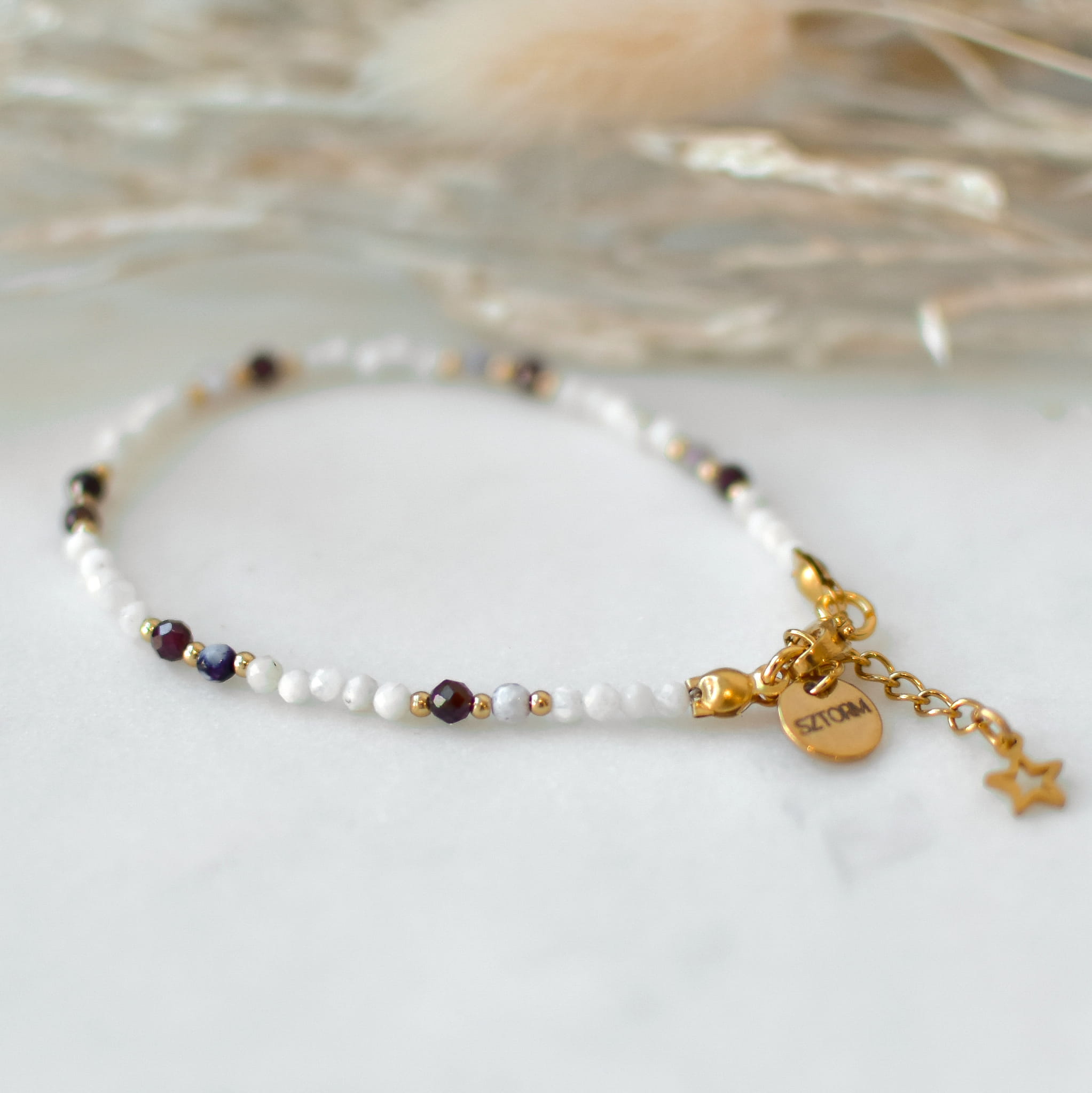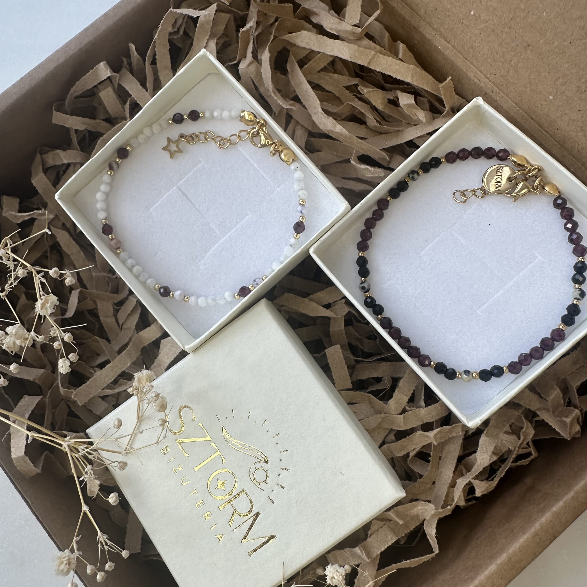 BRANSOLETKA VIOLET wykonana z Granatu, Spinelu, Jaspisu Dalmatyńskiego oraz złotych kulek ze stali chirurgicznej.