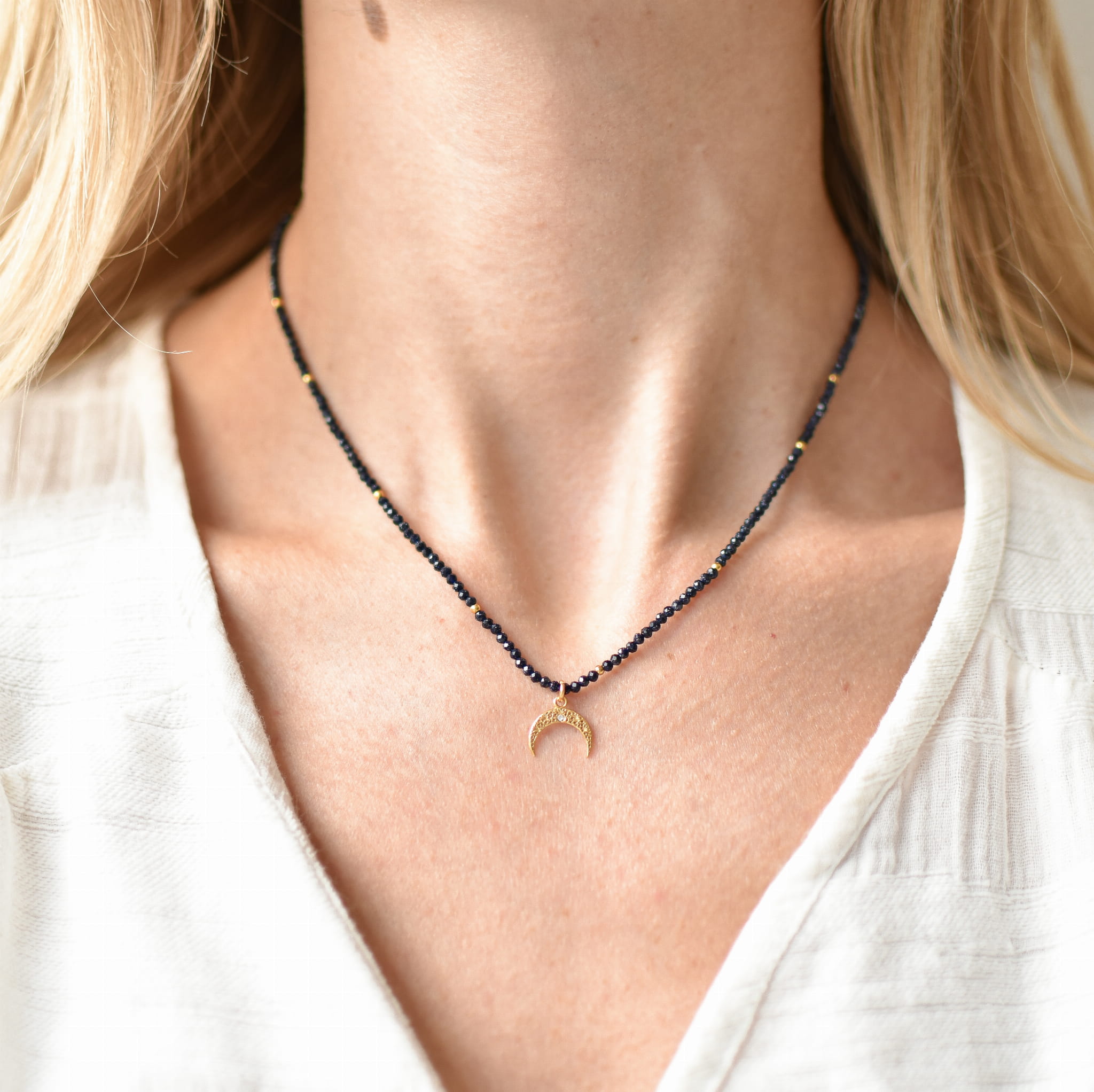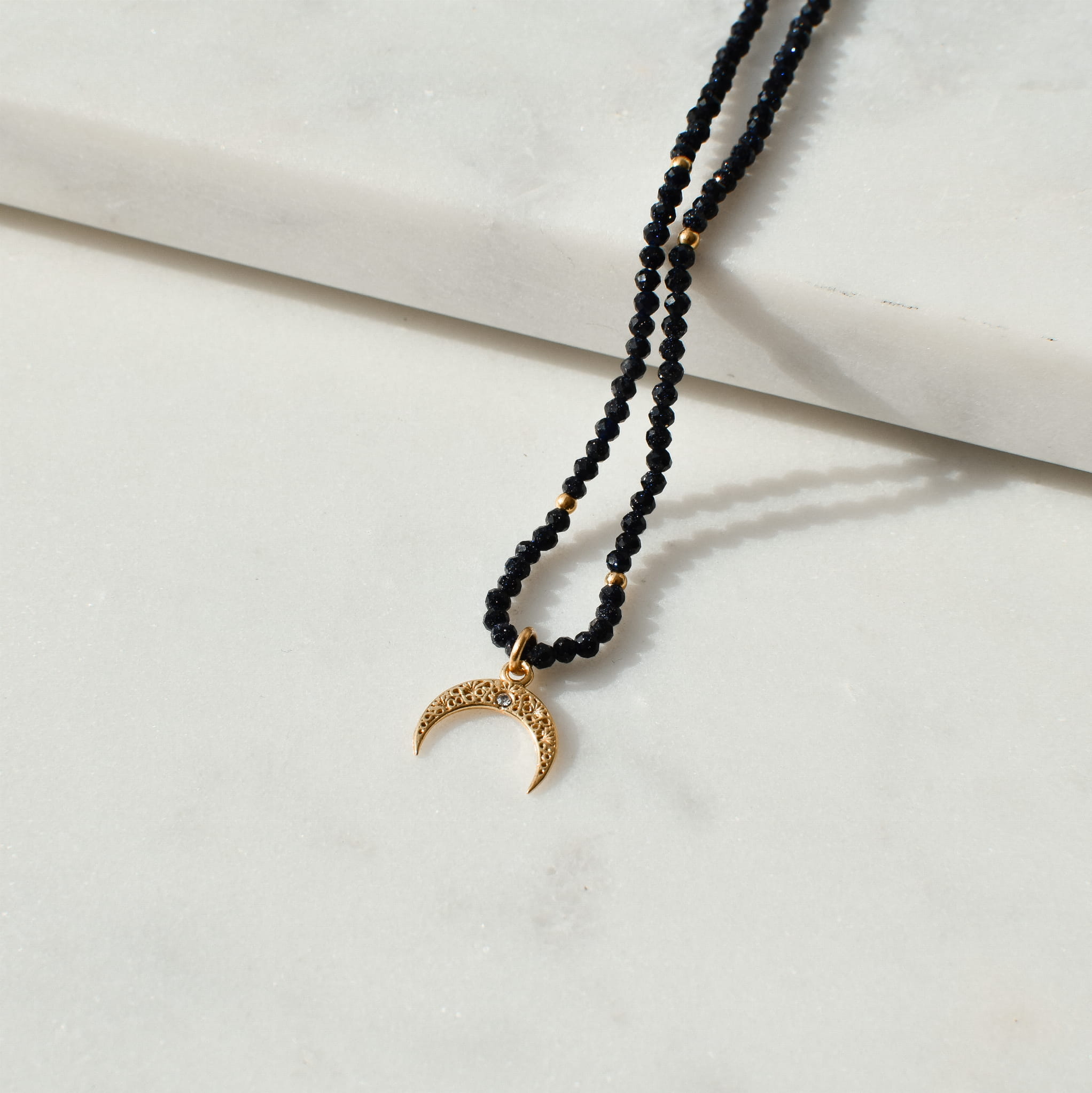 Naszyjnik COAST wykonany z Nocy Kairu oraz zawieszki i złotych kulek ze stali chirurgicznej.