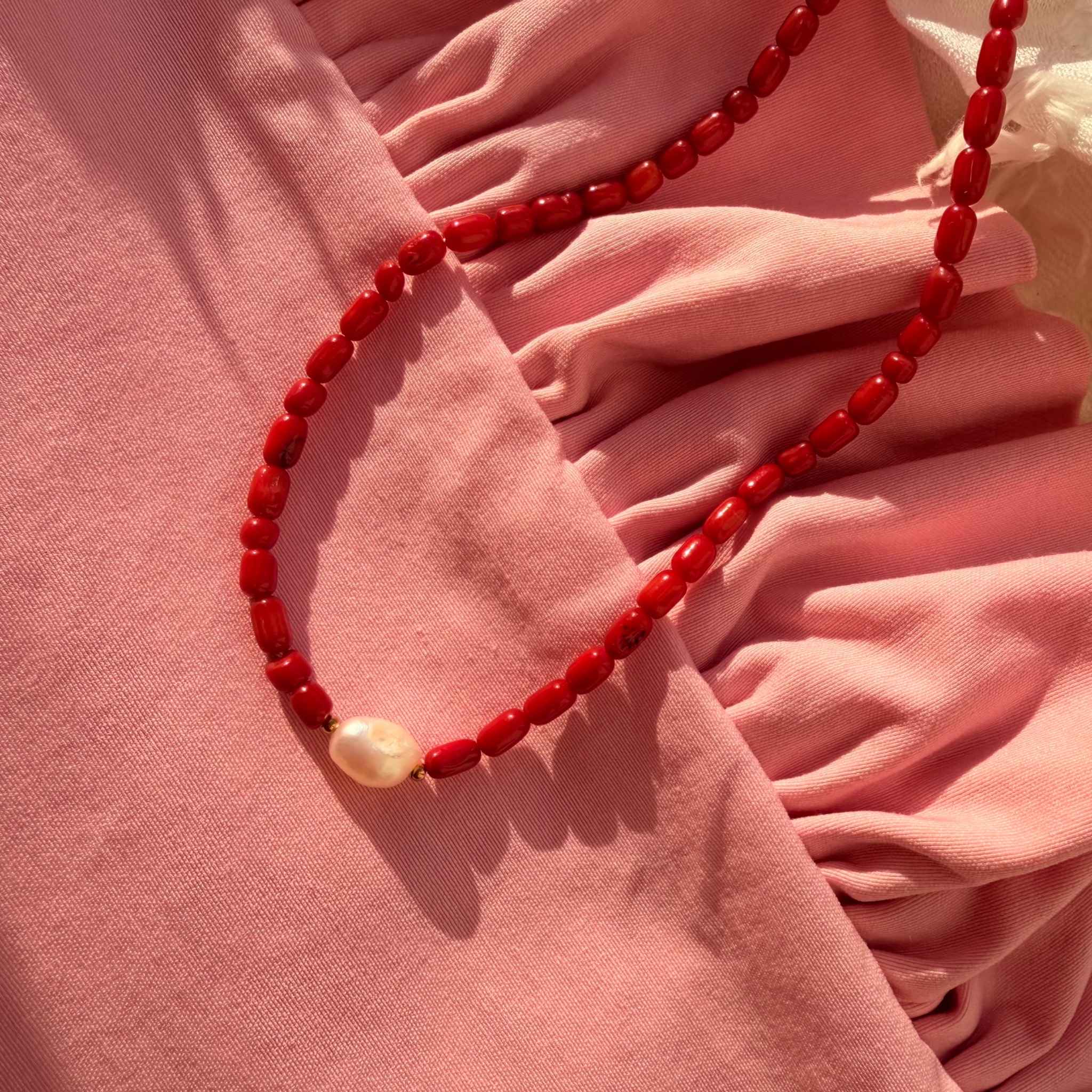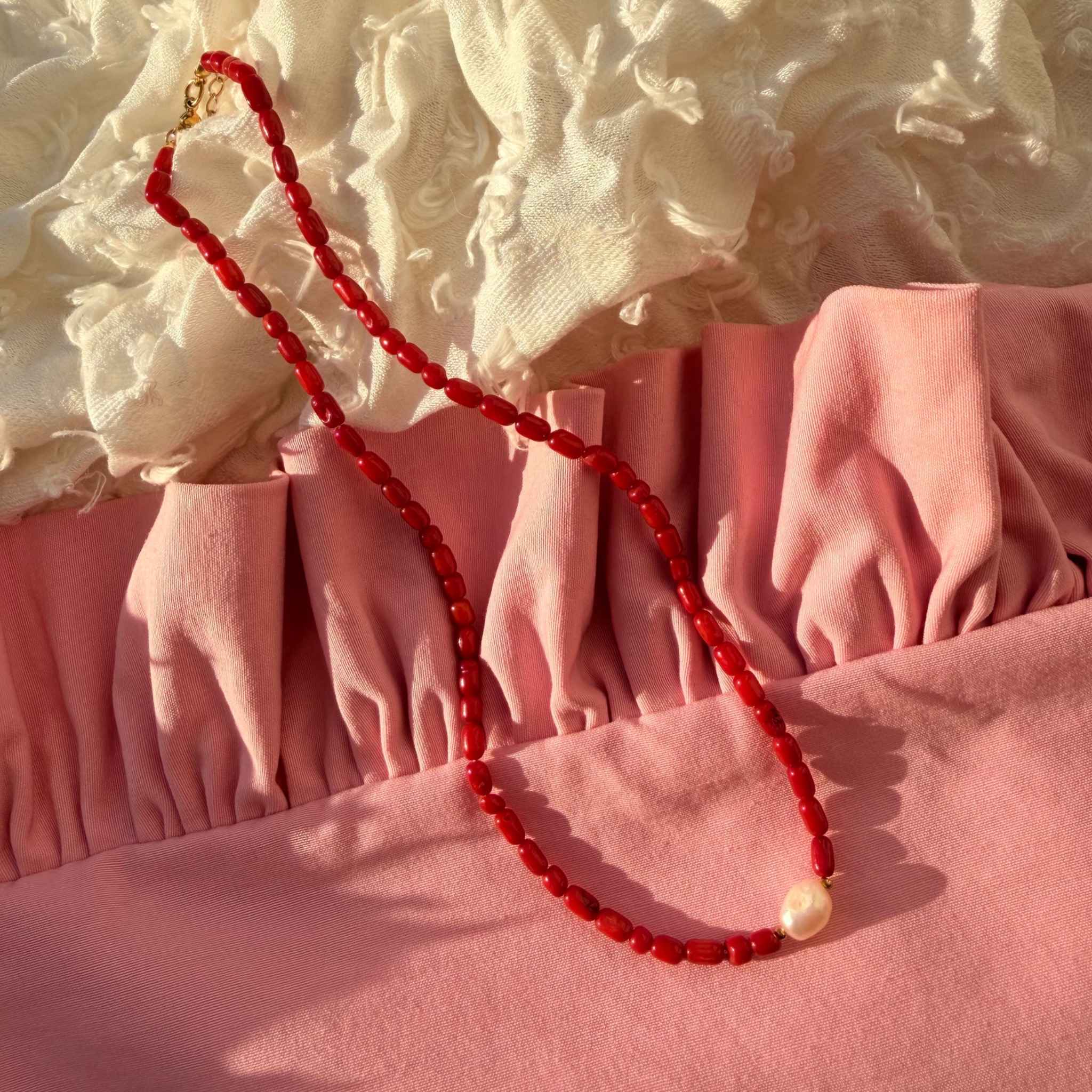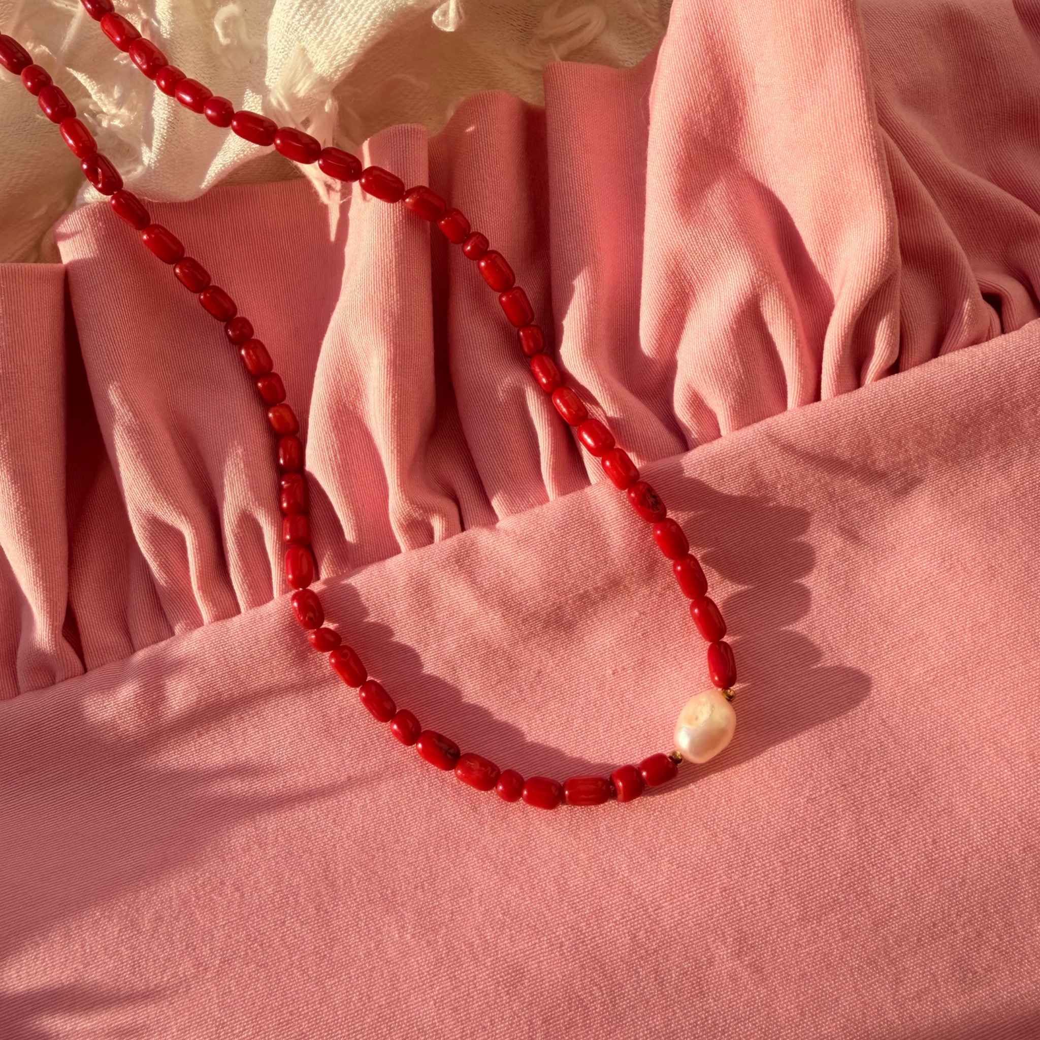 Naszyjnik BOJA to wyrazista, a jednocześnie subtelna kompozycja z naturalnego Czerwonego Koralu o średnicy 3 mm, przełamana delikatnym akcentem Perły hodowlanej.