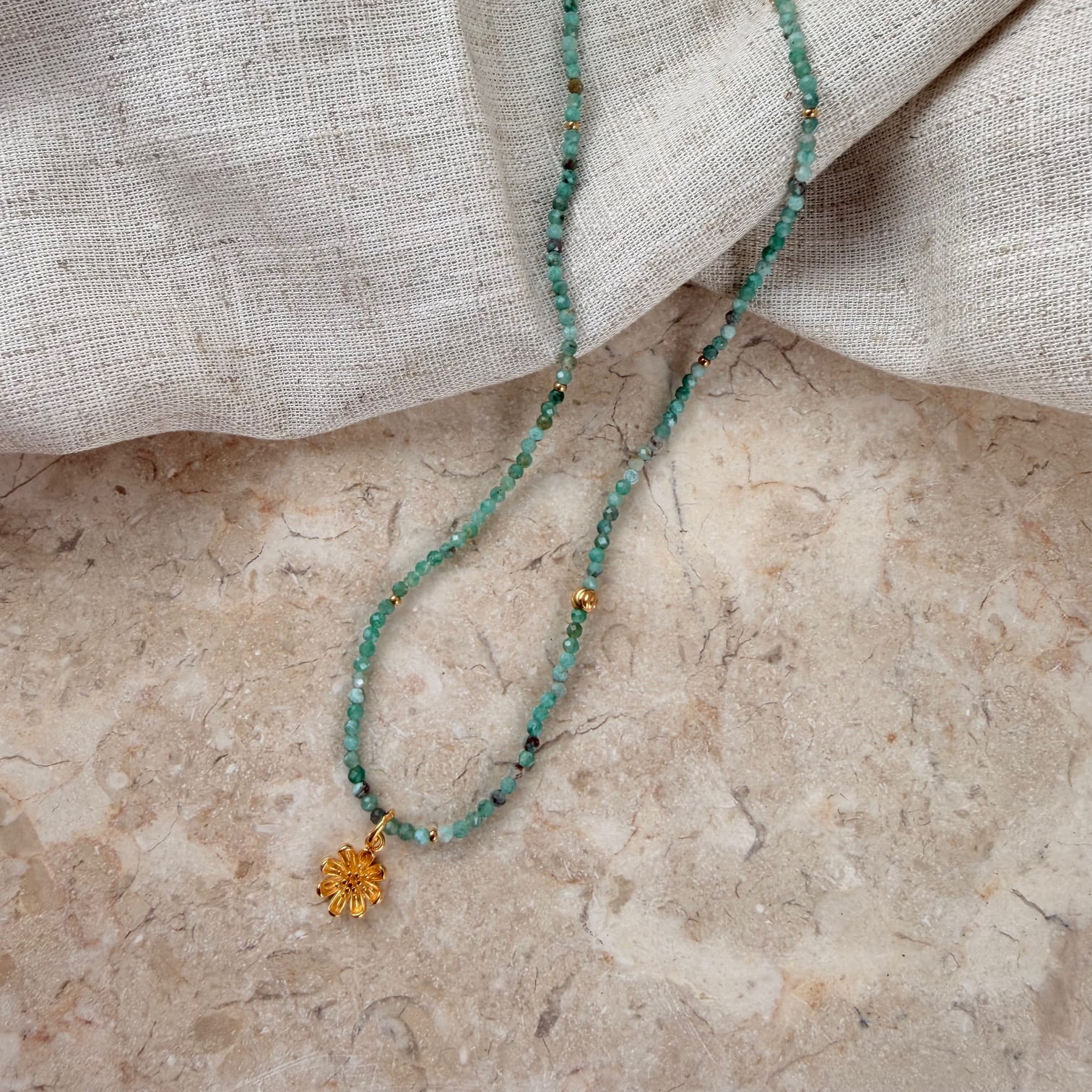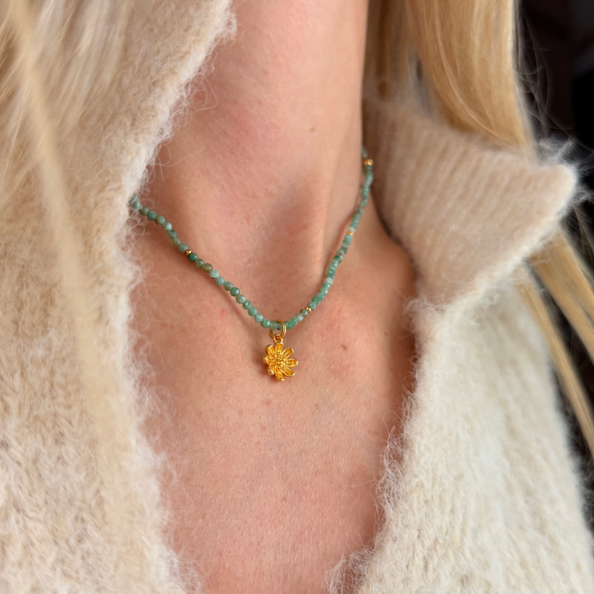 NASZYJNIK GREEN BLOOM wykonany z chryzokoli, złotych kulek ze stali chirurgicznej oraz pozłacanej zawieszki w kształcie kwiatka.