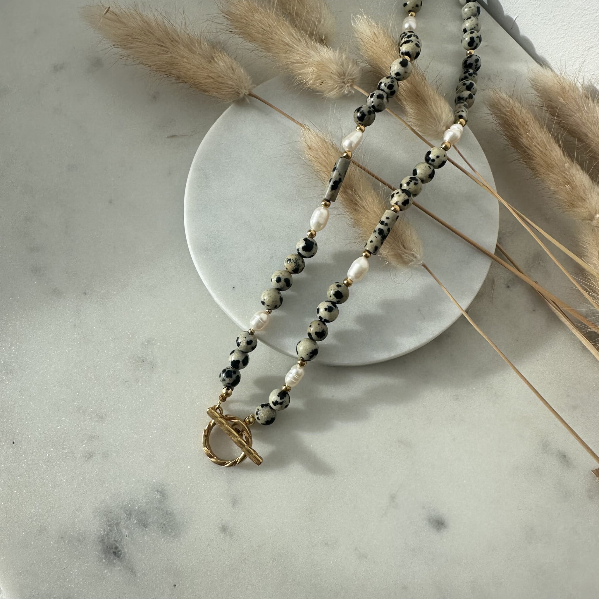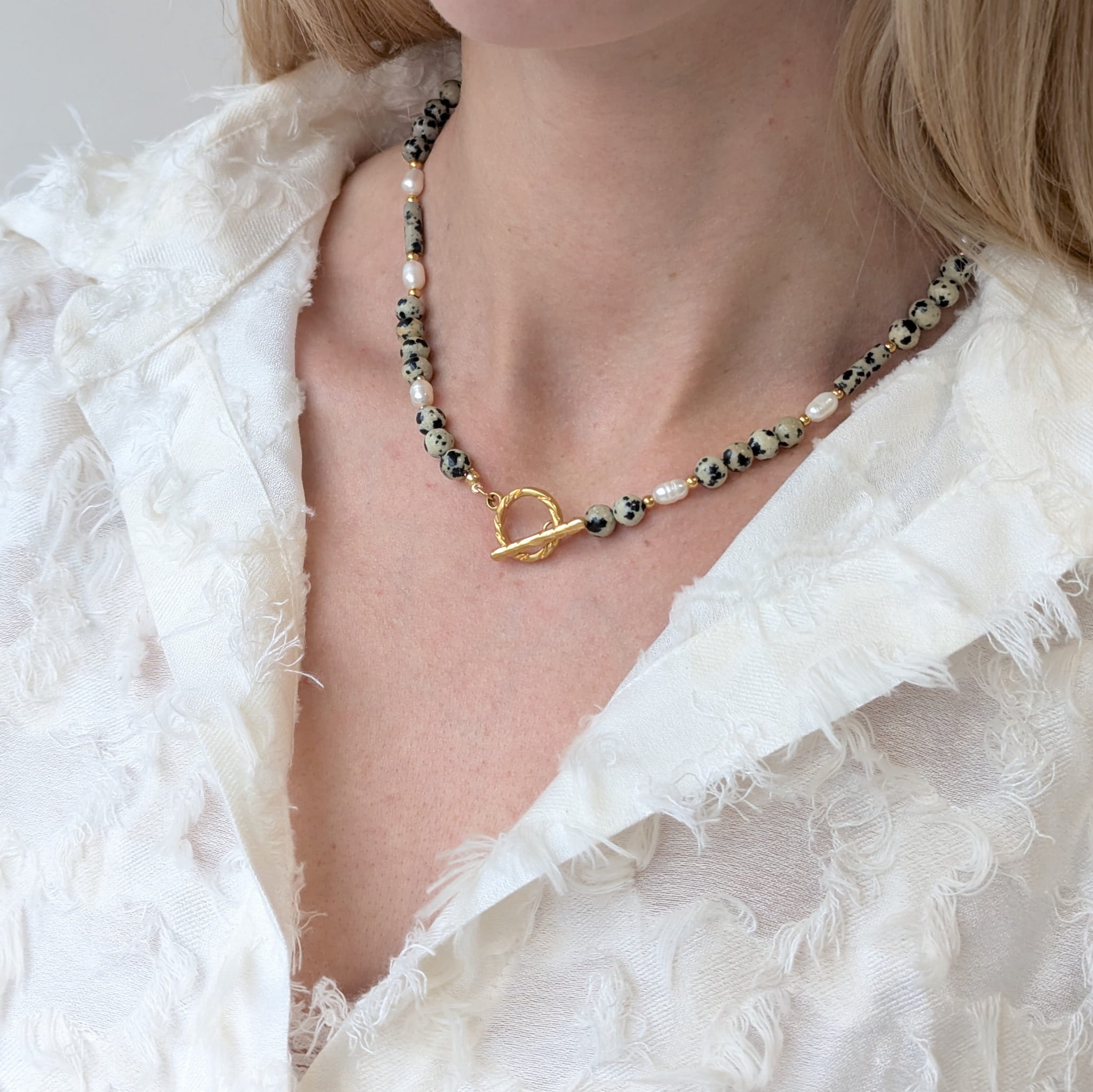 Naszyjnik SeaBorn wykonany z Jaspisu Dalmatyńskiego, Perły oraz złotych kulek ze stali chirurgicznej. Ozdobne zapięcie wykonane ze stali chirurgicznej można nosić zarówno z przodu jak i z tyłu.