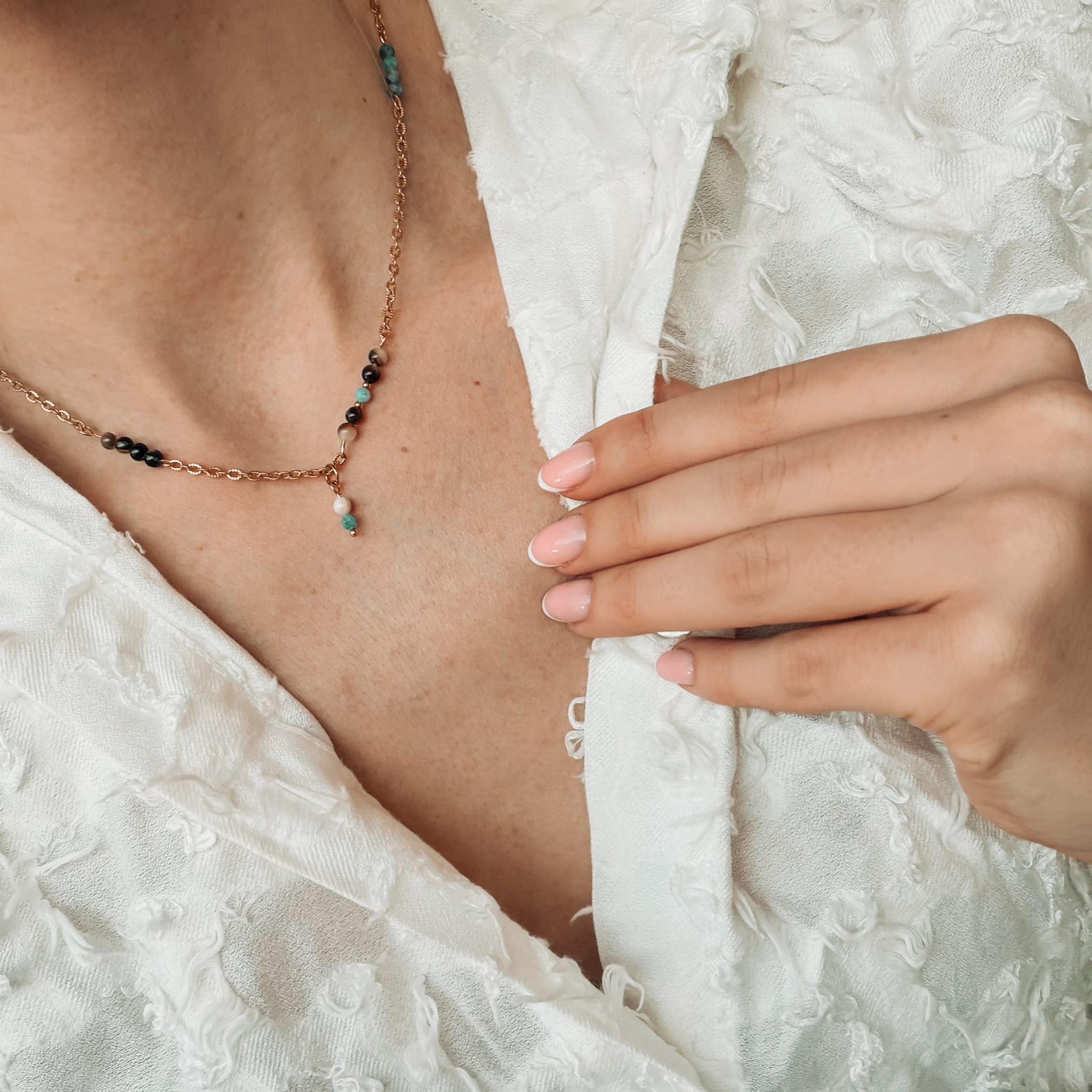 Naszyjnik ZATOKA to ciepła, harmonijna kompozycja z drobnej Muszli w odcieniach brązu i bieli o średnicy ok. 2 mm, połączonej z Turkusem oraz złotym łańcuszkiem ze stali chirurgicznej. Naturalne, piaskowe barwy muszli spotykają się z turkusowym akcentem, tworząc spokojną całość inspirowaną zatoką — miejscem, gdzie morze jest ciche, a linia brzegu miękka i jasna. Złoty łańcuszek dodaje biżuterii eleganckiego, letniego charakteru.