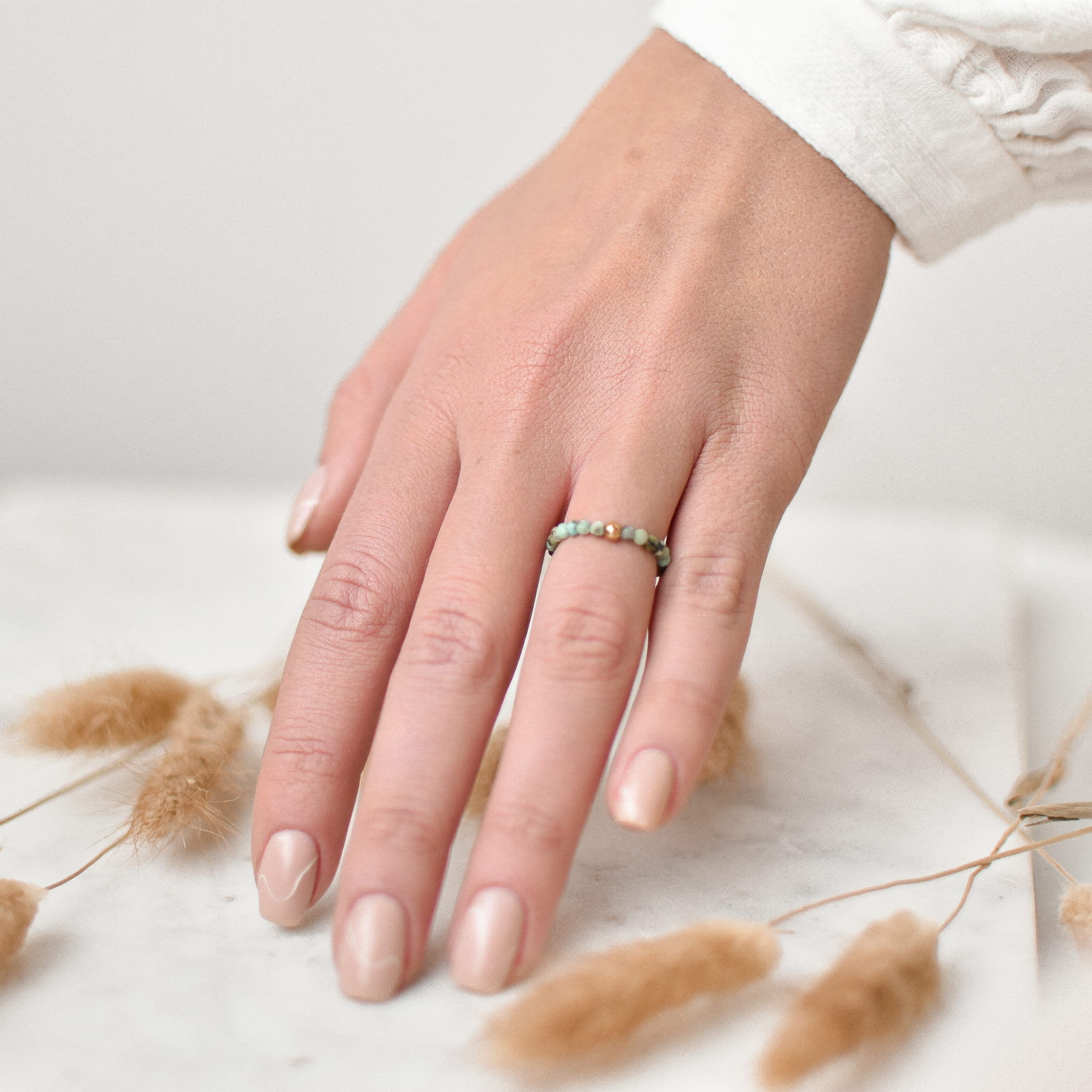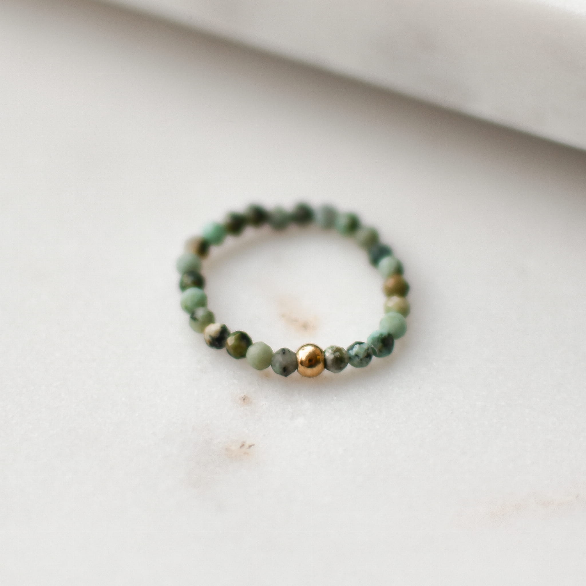 PIERŚCIONEK ELASTYCZNY ALGAE wykonany z Turkusu Afrykańskiego i złotej kulki ze stali chirurgicznej.