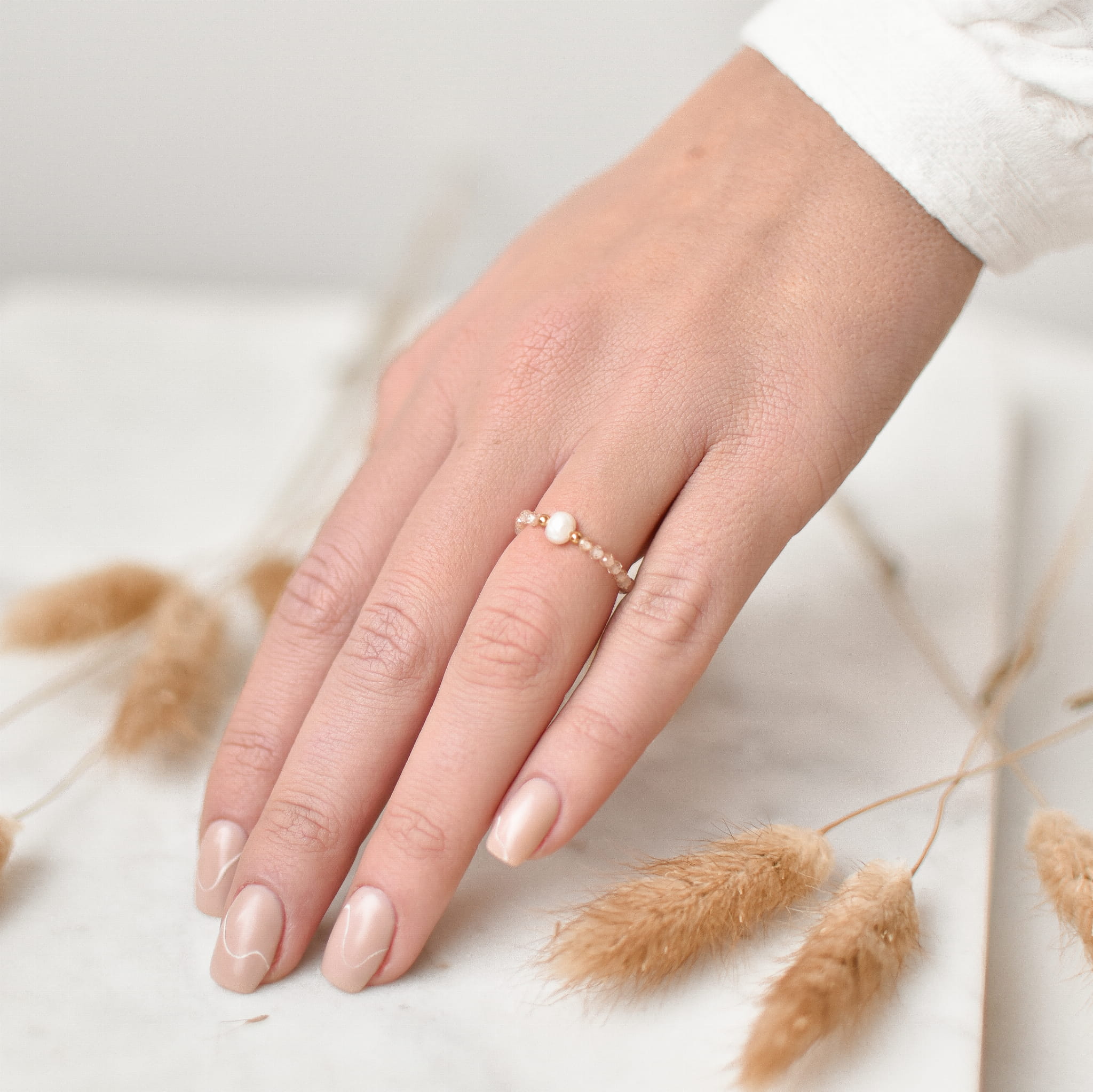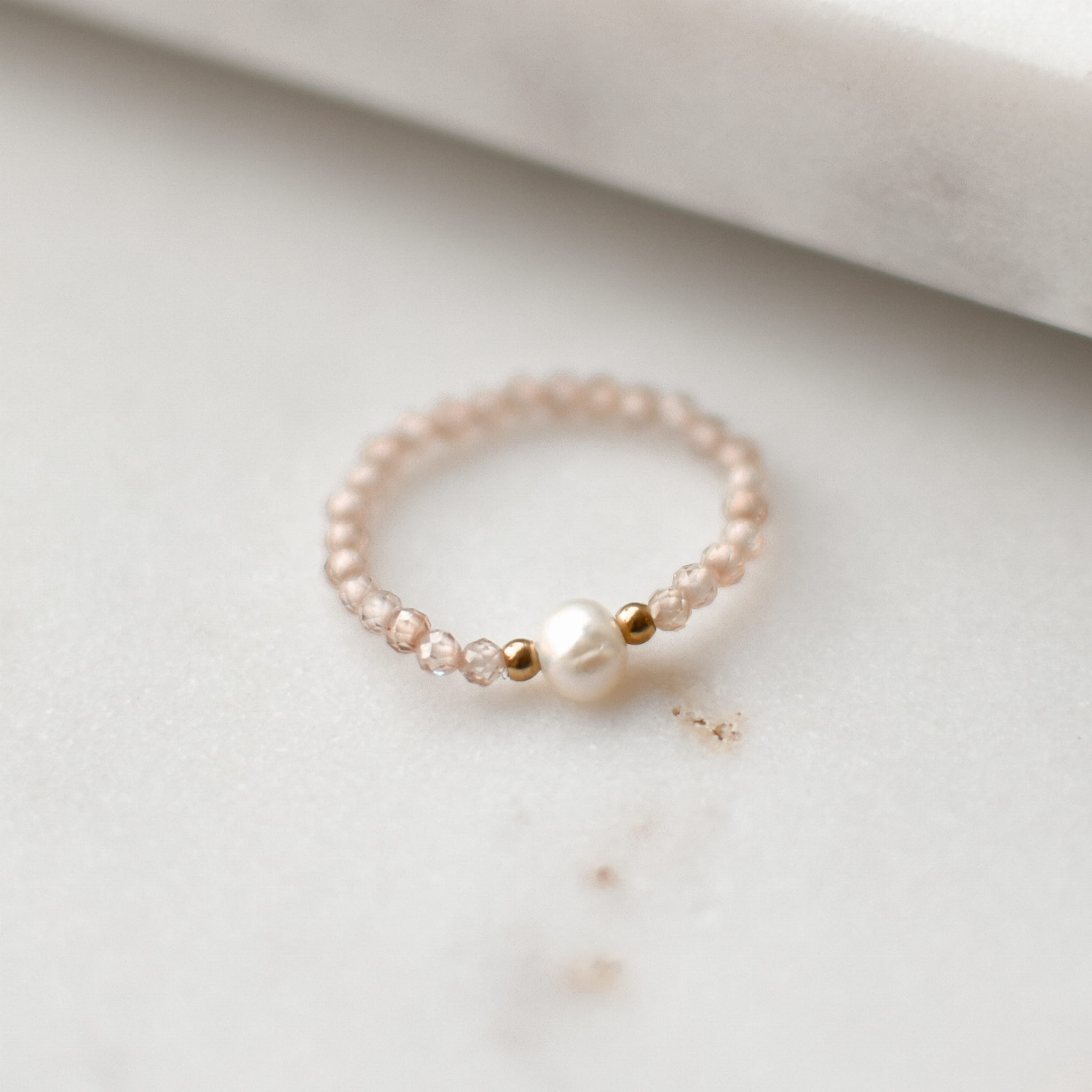 PIERŚCIONEK ELASTYCZNY CHICK wykonany z Cytrynu, Perły i złotych kulek ze stali chirurgicznej.