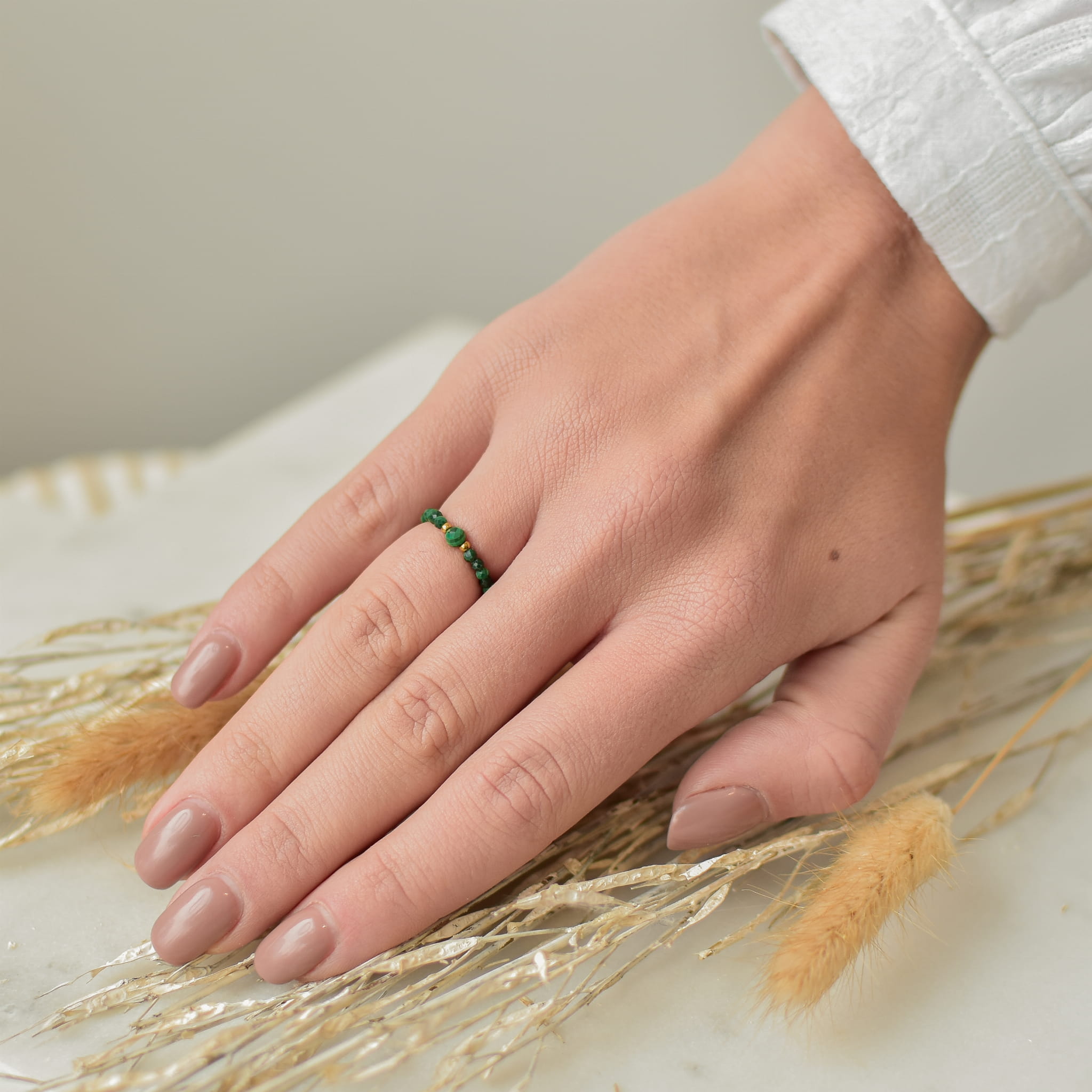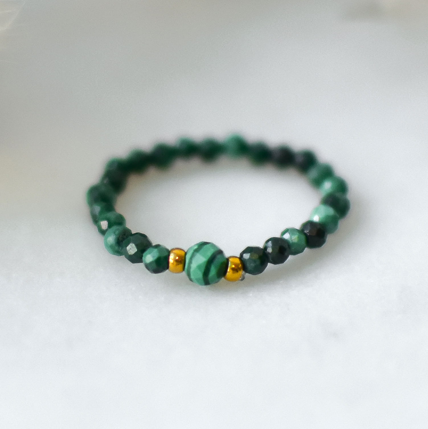 PIERŚCIONEK ELASTYCZNY FIONA wykonany z Malachitu oraz złotych kulek ze stali chirurgicznej.