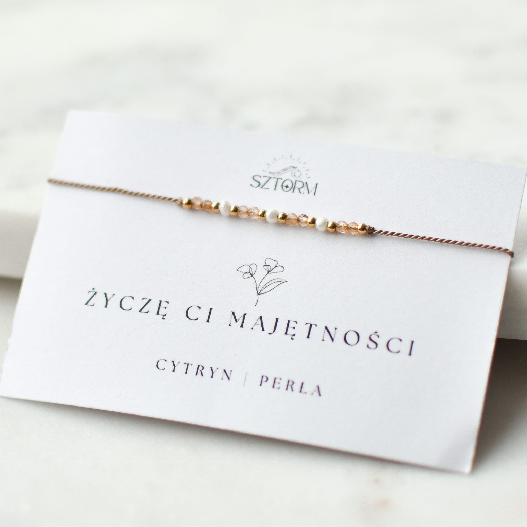 BRANSOLETKA ŻYCZĘ CI MAJĘTNOŚCI wykonana z kamienia naturalnego Cytrynu, Pereł oraz złotych kulek ze stali chirurgicznej na jedwabnym sznurku. Pakujemy ją w ozdobne pudełko wraz z liścikiem życzeniowym ze znaczeniem kamieni.