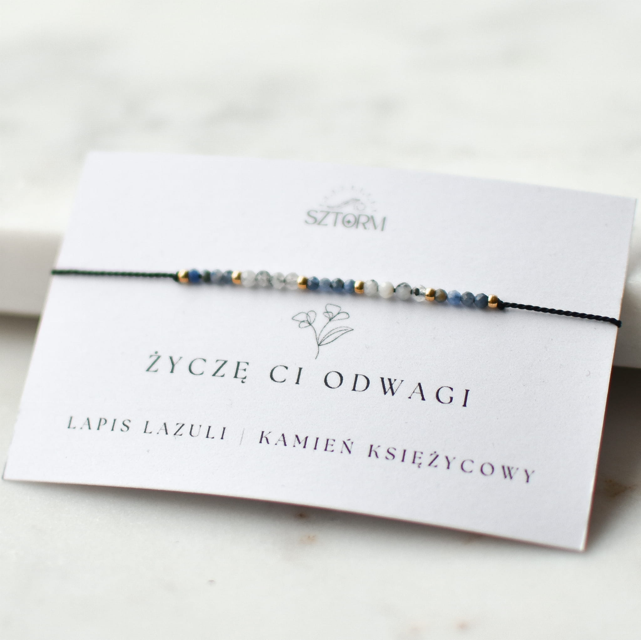 BRANSOLETKA ŻYCZĘ CI ODWAGI wykonana z Kamienia Księżycowego, Lapis Lazuli oraz złotych kulek ze stali chirurgicznej na jedwabnym sznurku. Pakujemy ją w ozdobne pudełko wraz z liścikiem życzeniowym ze znaczeniem kamieni.