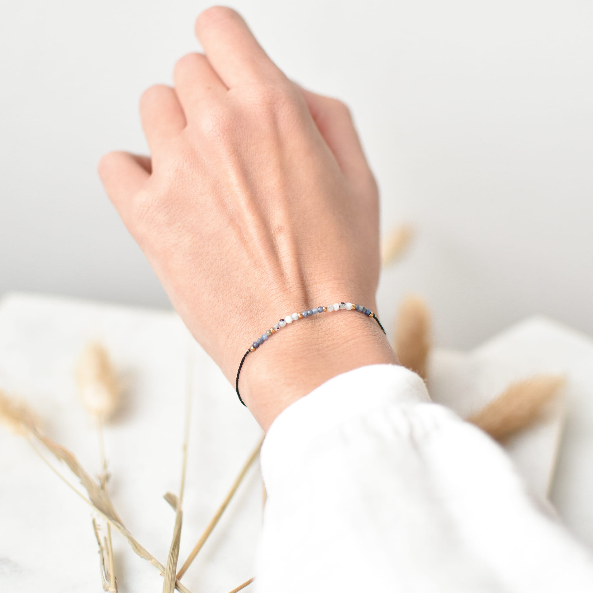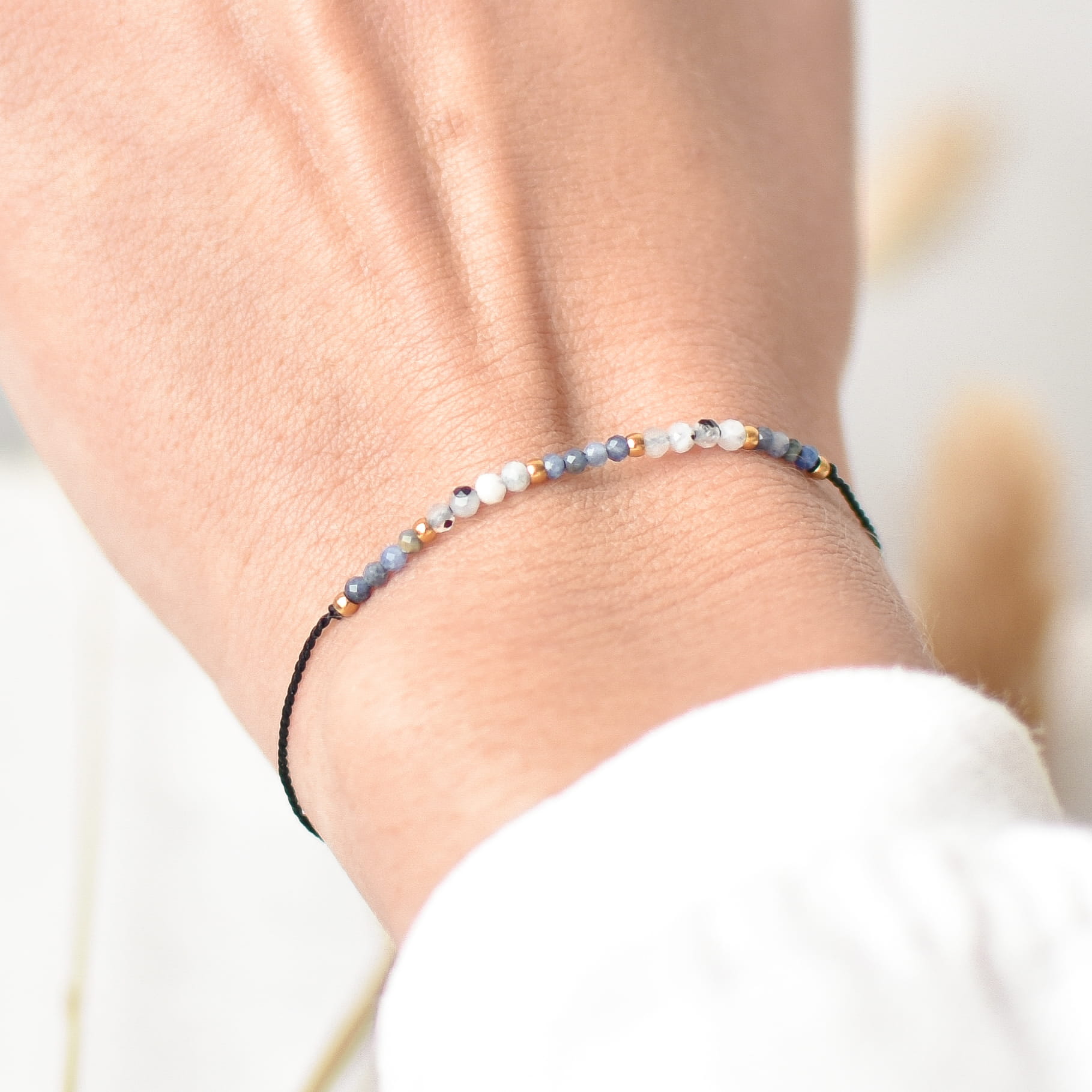 BRANSOLETKA ŻYCZĘ CI ODWAGI wykonana z Kamienia Księżycowego, Lapis Lazuli oraz złotych kulek ze stali chirurgicznej na jedwabnym sznurku.