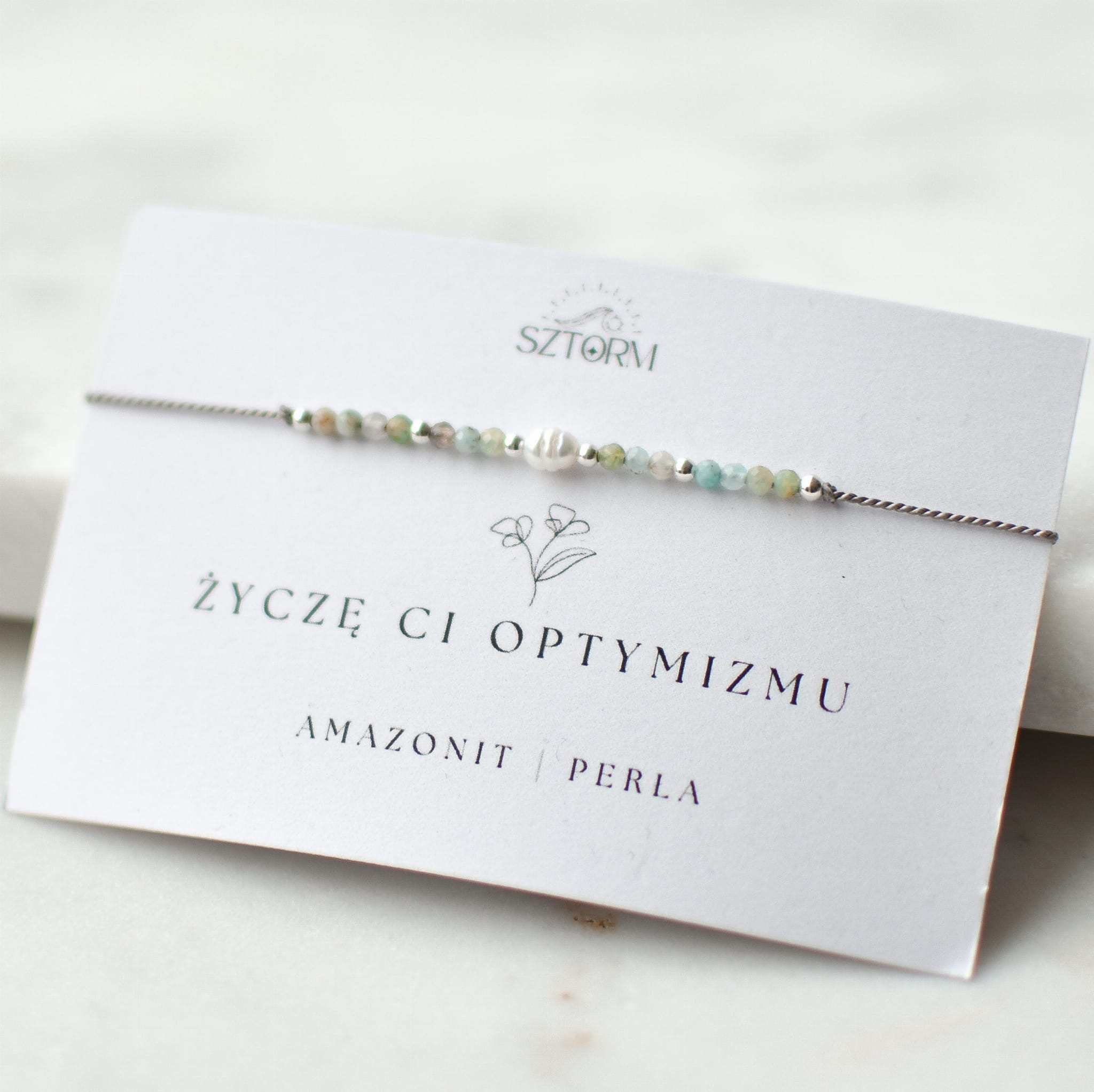 BRANSOLETKA ŻYCZĘ CI OPTYMIZMU wykonana z kamienia naturalnego Amazonitu, Pereł oraz srebrnych kulek na jedwabnym sznurku. Pakujemy ją w ozdobne pudełko wraz z liścikiem życzeniowym ze znaczeniem kamieni.