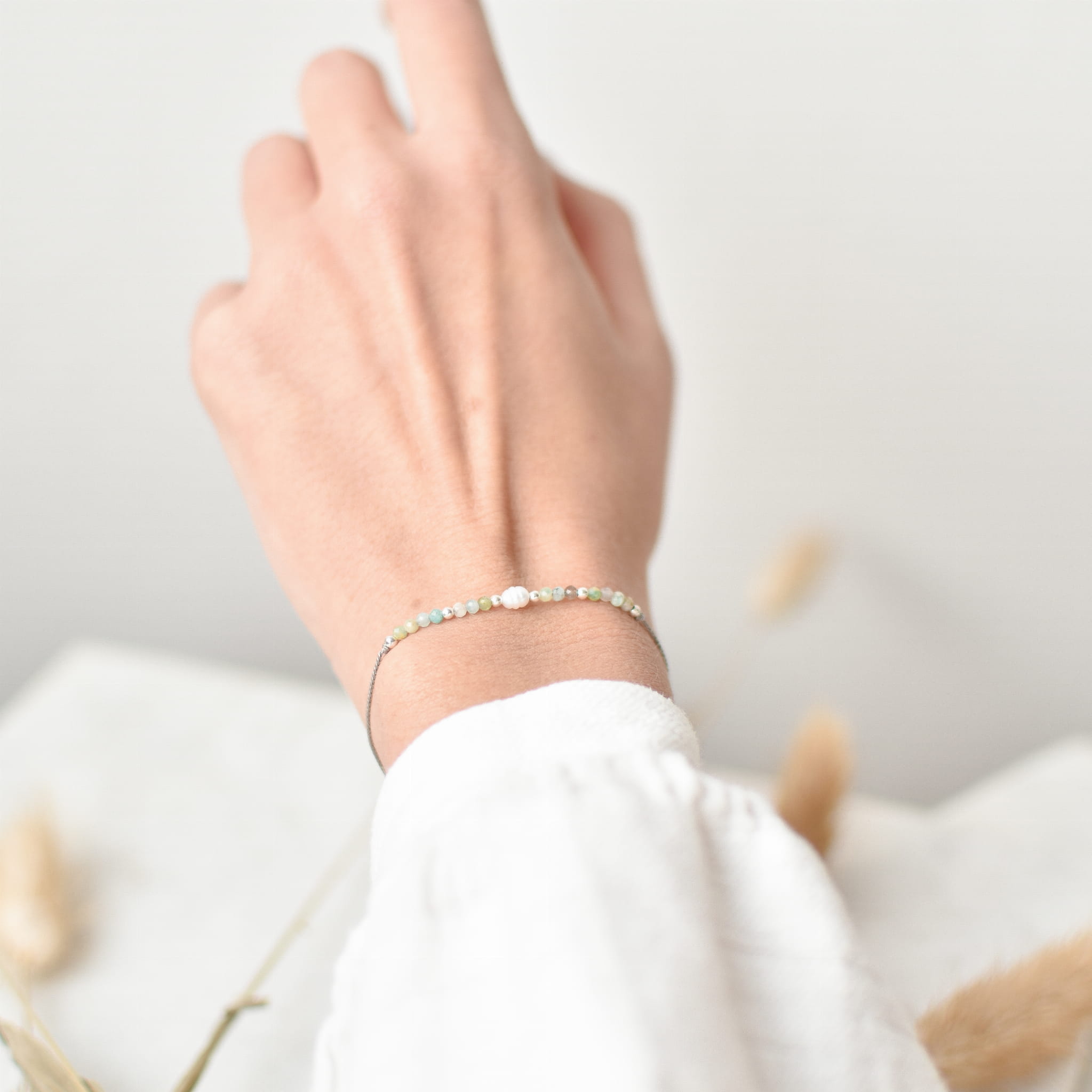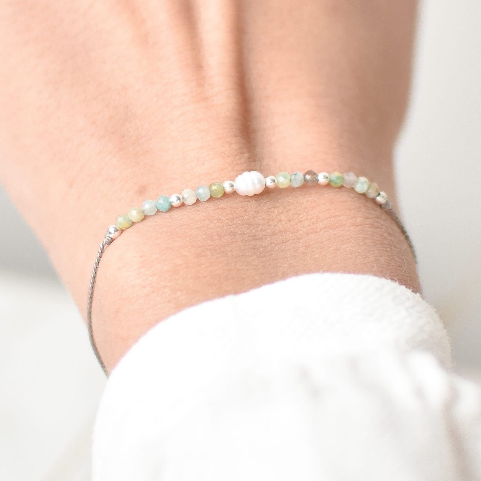 BRANSOLETKA ŻYCZĘ CI OPTYMIZMU wykonana z kamienia naturalnego Amazonitu, Pereł oraz srebrnych kulek na jedwabnym sznurku.