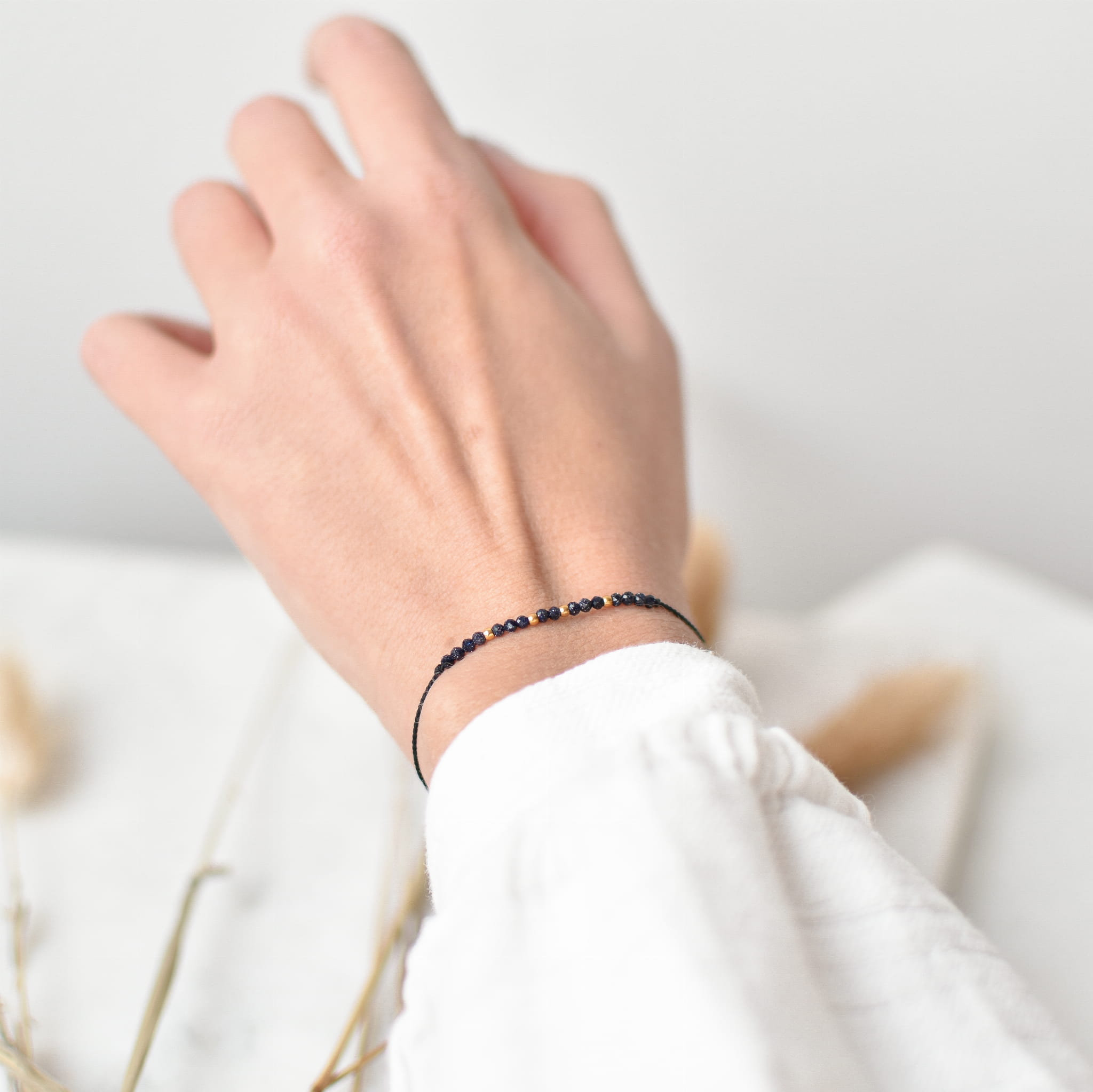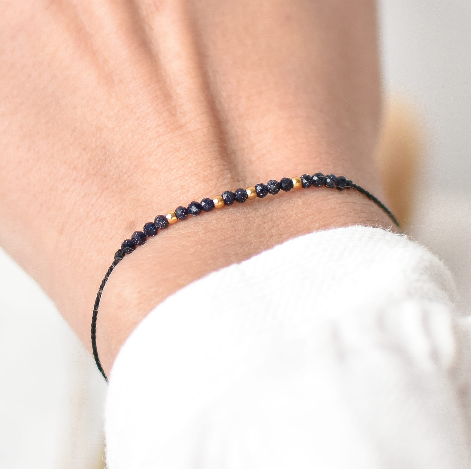 BRANSOLETKA ŻYCZĘ CI SPEŁNIENIA MARZEŃ wykonana z kamienia Noc Kairu oraz złotych kulek ze stali chirurgicznej na jedwabnym sznurku.