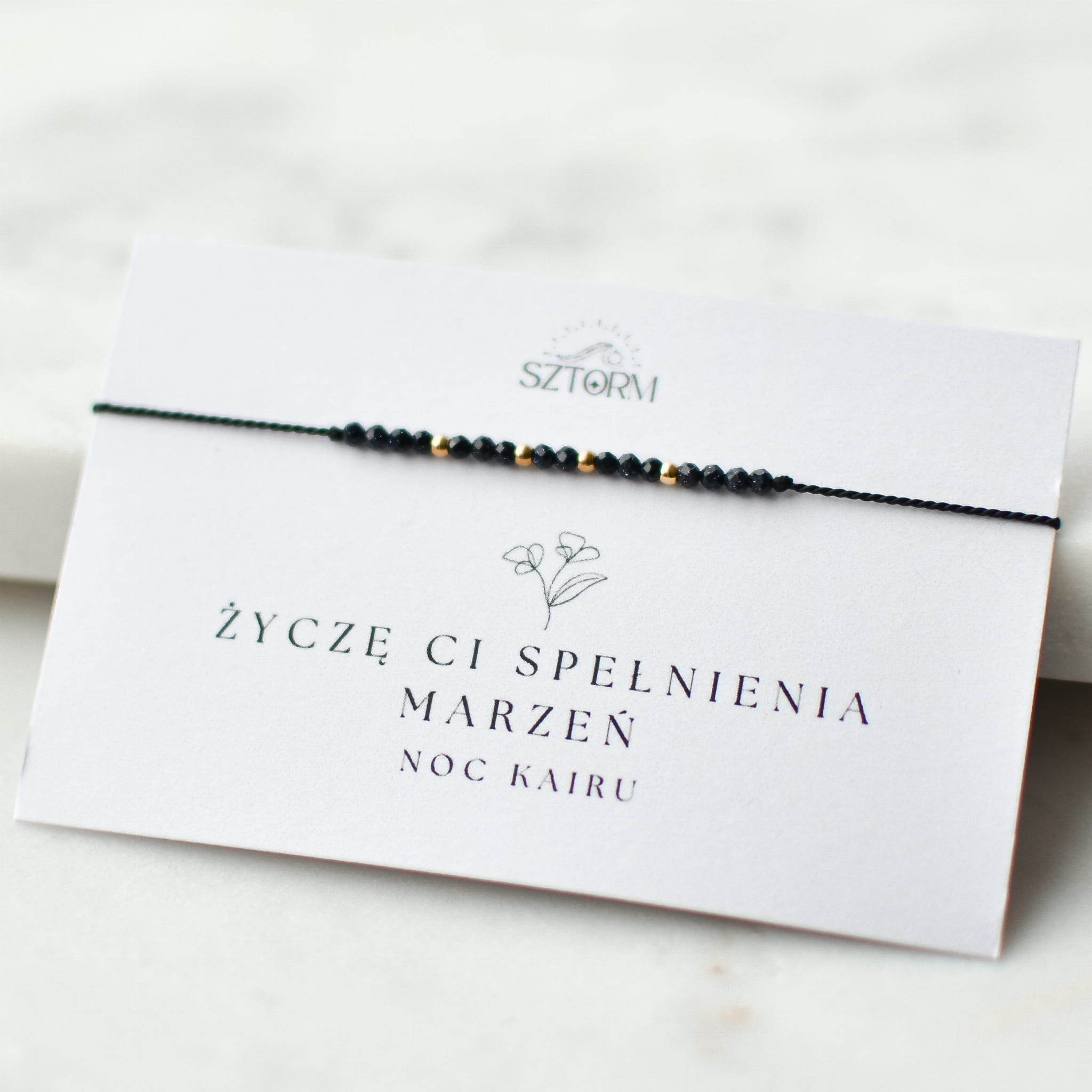 BRANSOLETKA ŻYCZĘ CI SPEŁNIENIA MARZEŃ wykonana z kamienia Noc Kairu oraz złotych kulek ze stali chirurgicznej na jedwabnym sznurku. Pakujemy ją w ozdobne pudełko wraz z liścikiem życzeniowym ze znaczeniem kamieni.